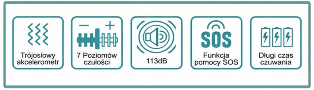 - Głośność alarmu: do 113 dB