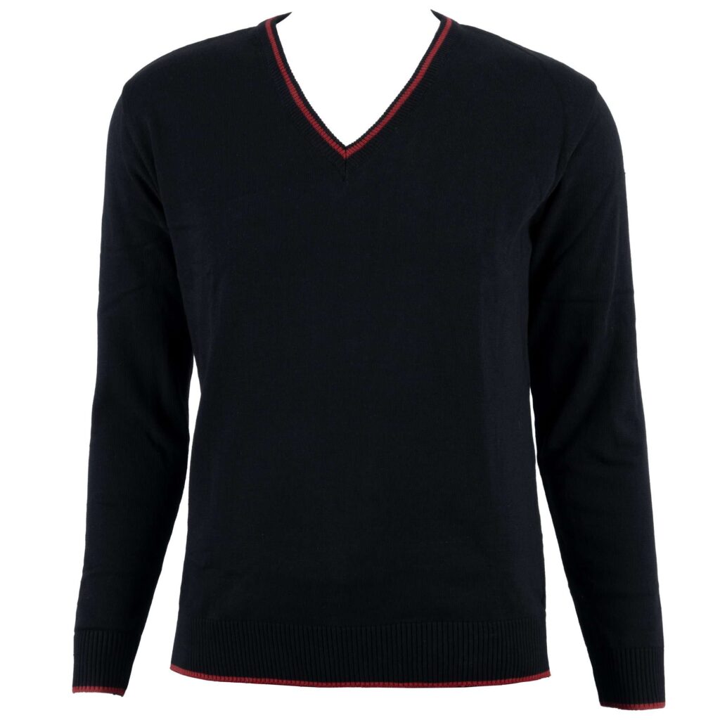 Elegancki, męski sweter w klasycznej czerni z wyrazistym czerwonym wykończeniem przy dekolcie, rękawach i dolnym ściągaczu. Model z dekoltem w serek (V-neck) świetnie komponuje się zarówno z koszulą, jak i T-shirtem, sprawdzając się w stylizacjach codziennych i półformalnych.