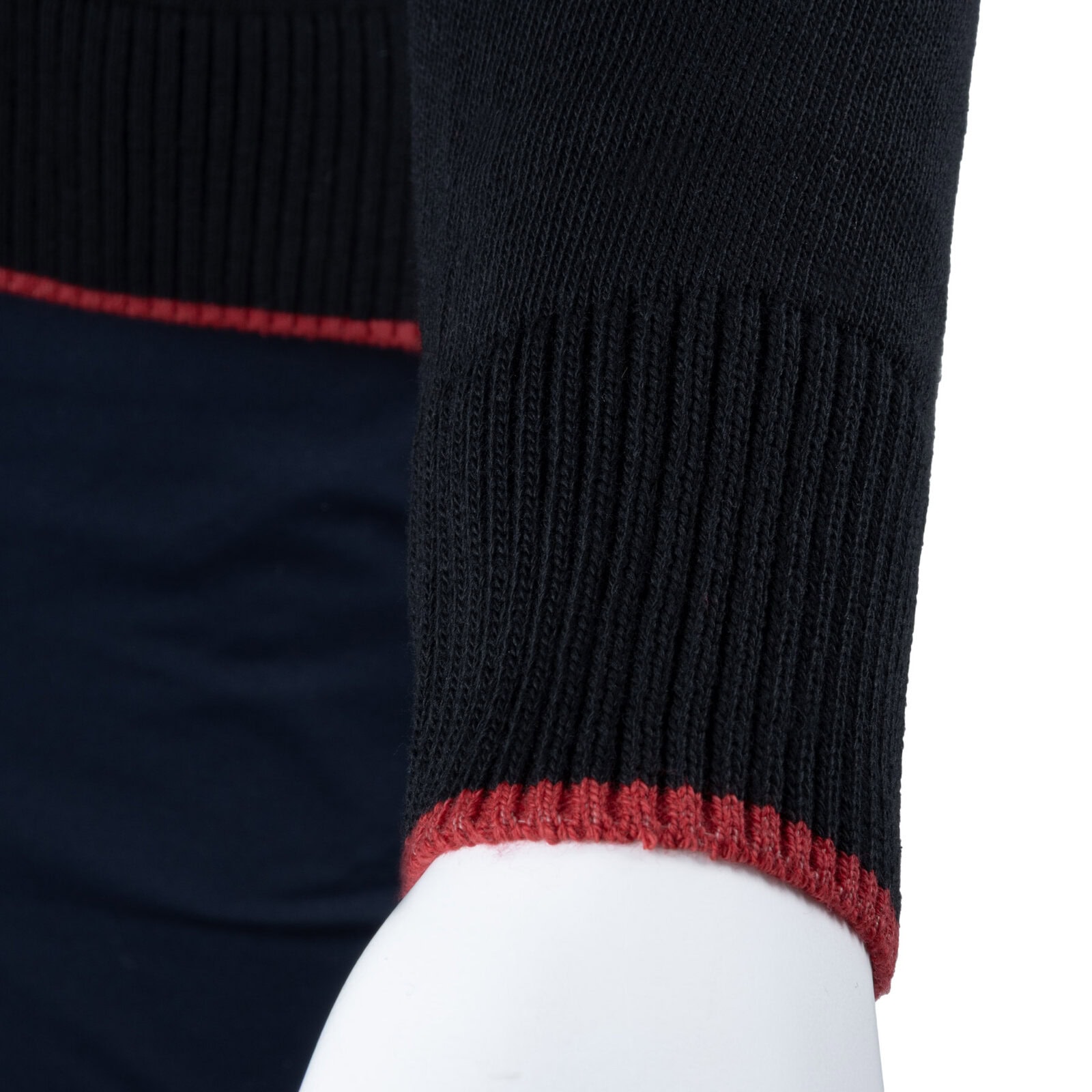 Stylowy sweter damski V-neck z długim rękawem w kolorze czarnym i czerwoną lamówką. Miękka bawełniano-akrylowa dzianina, wygodny krój i ponadczasowy wygląd.