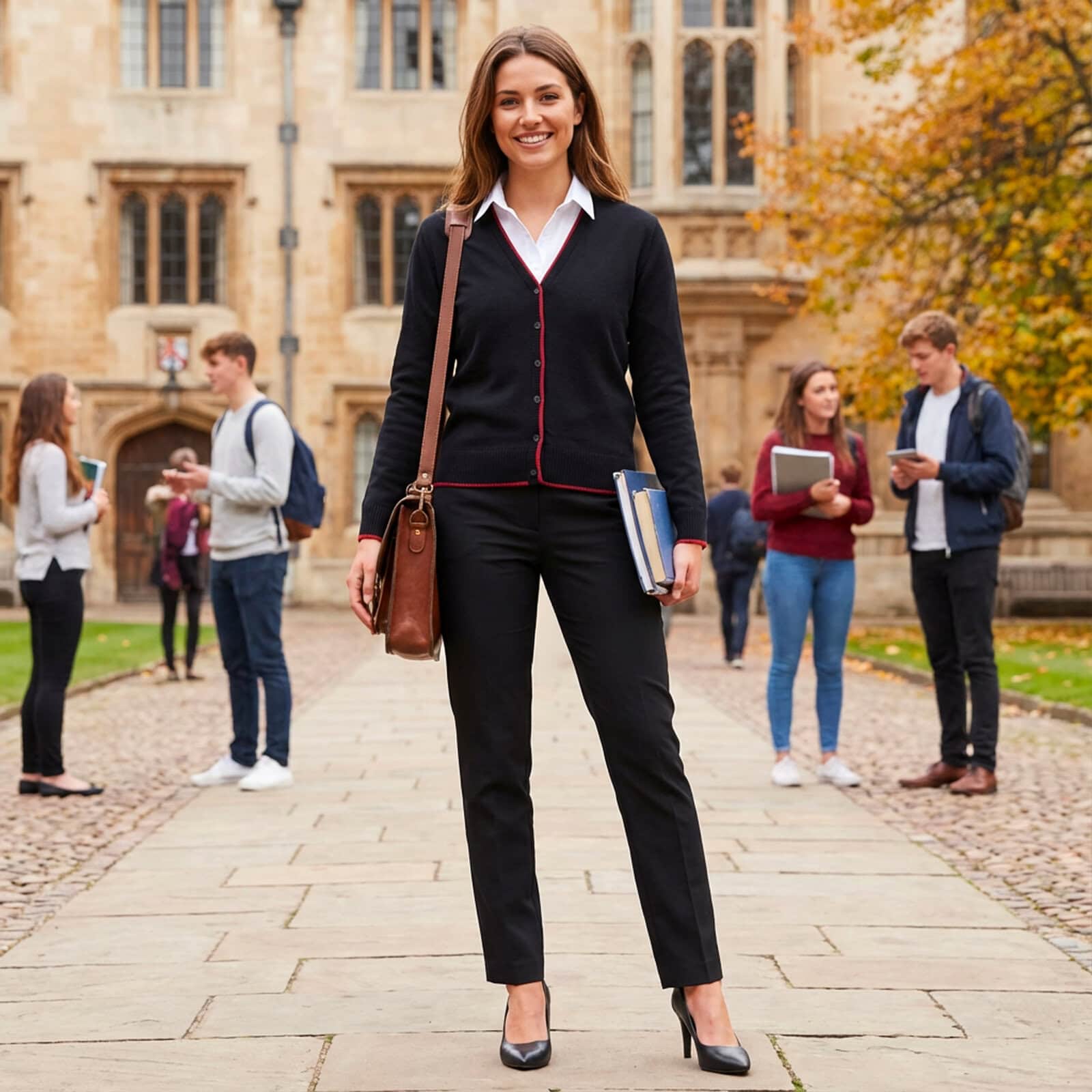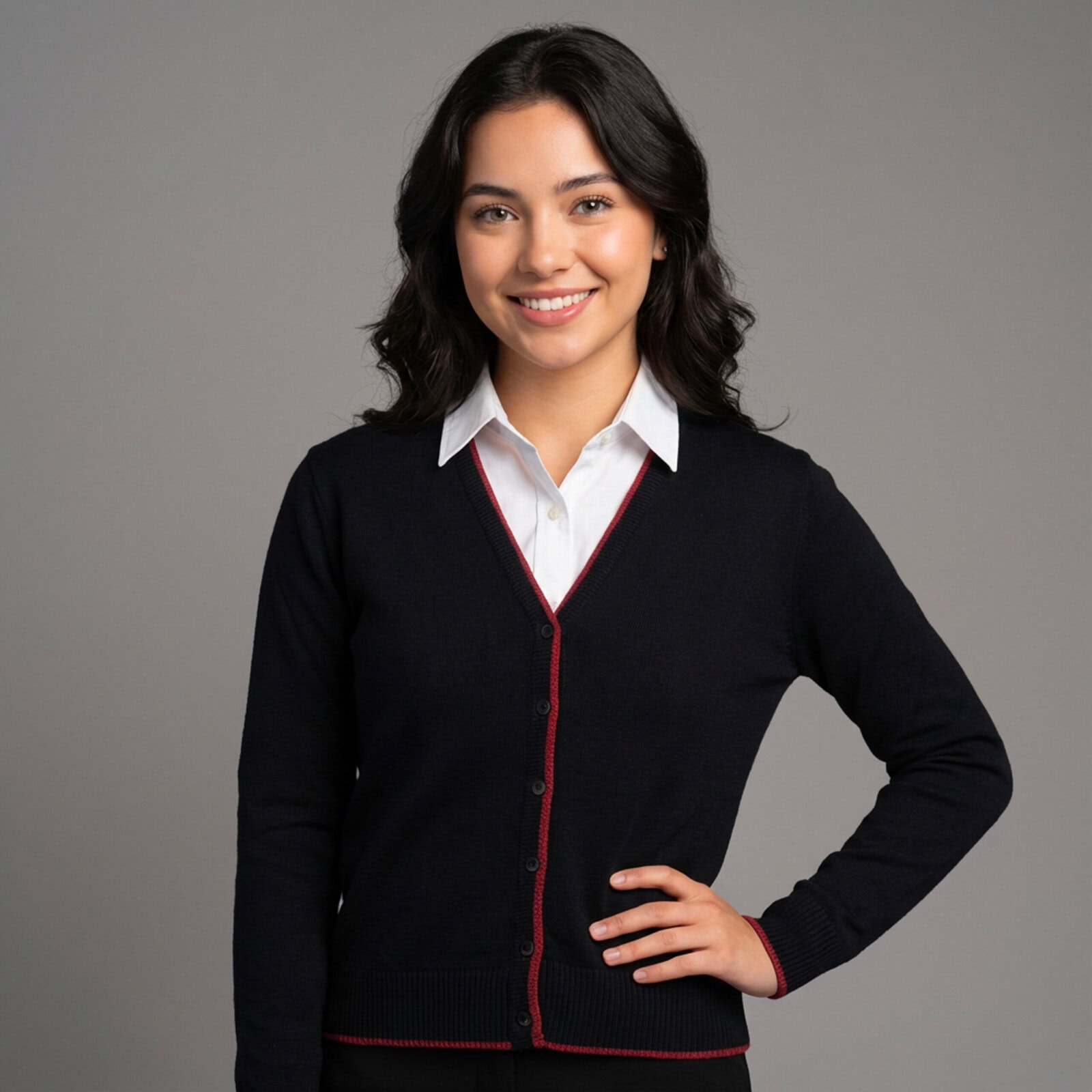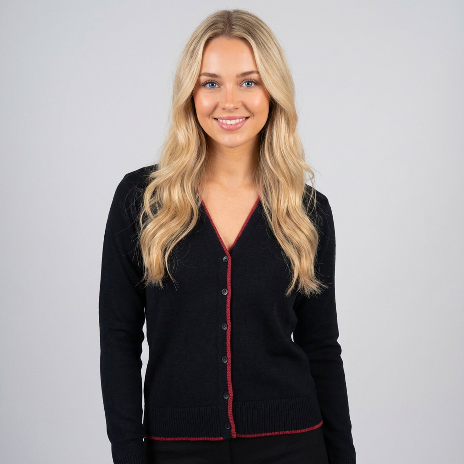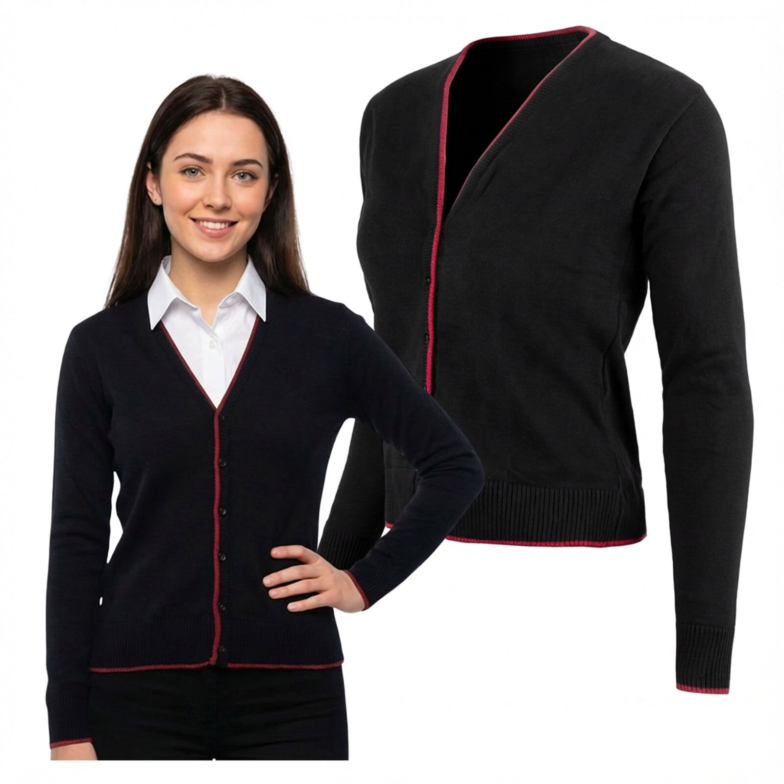 Stylowy i funkcjonalny sweter damski zapinany na guziki, w klasycznej czerni z kontrastowym czerwonym wykończeniem. Idealny wybór do biura, na uczelnię czy spotkania – podkreśla sylwetkę i pasuje zarówno do koszuli, jak i topu. Dekolt w serek i dopracowane detale nadają mu elegancki, a jednocześnie nowoczesny charakter.