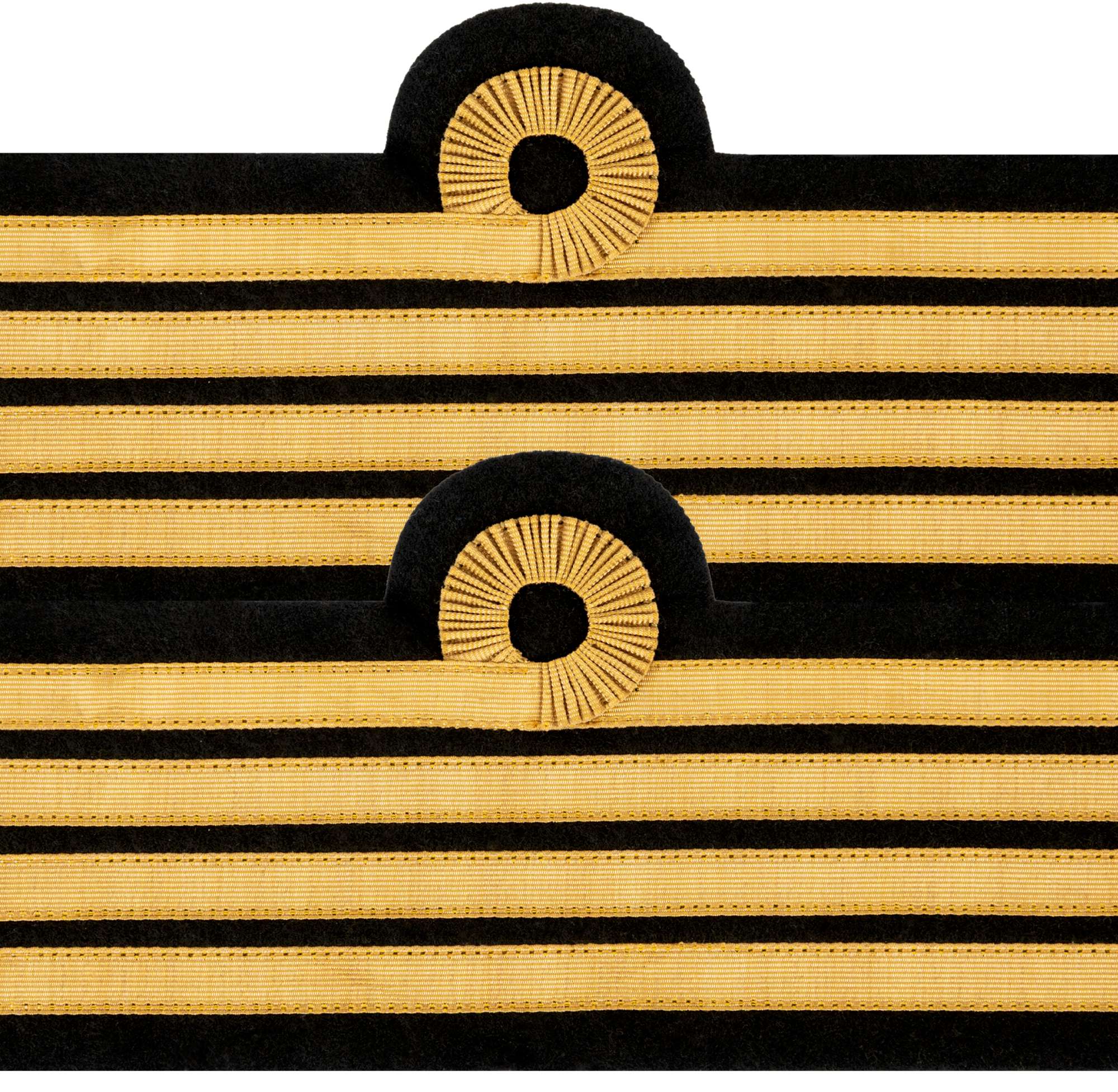 Dystynkcje rękawowe do munduru wyjściowego Marynarki Wojennej RP w stopniu Kapitan. Wykonane na czarnym sukiennym podkładzie ze złotą nicią, przeznaczone do naszycia na oba rękawy. Komplet 2 sztuki.