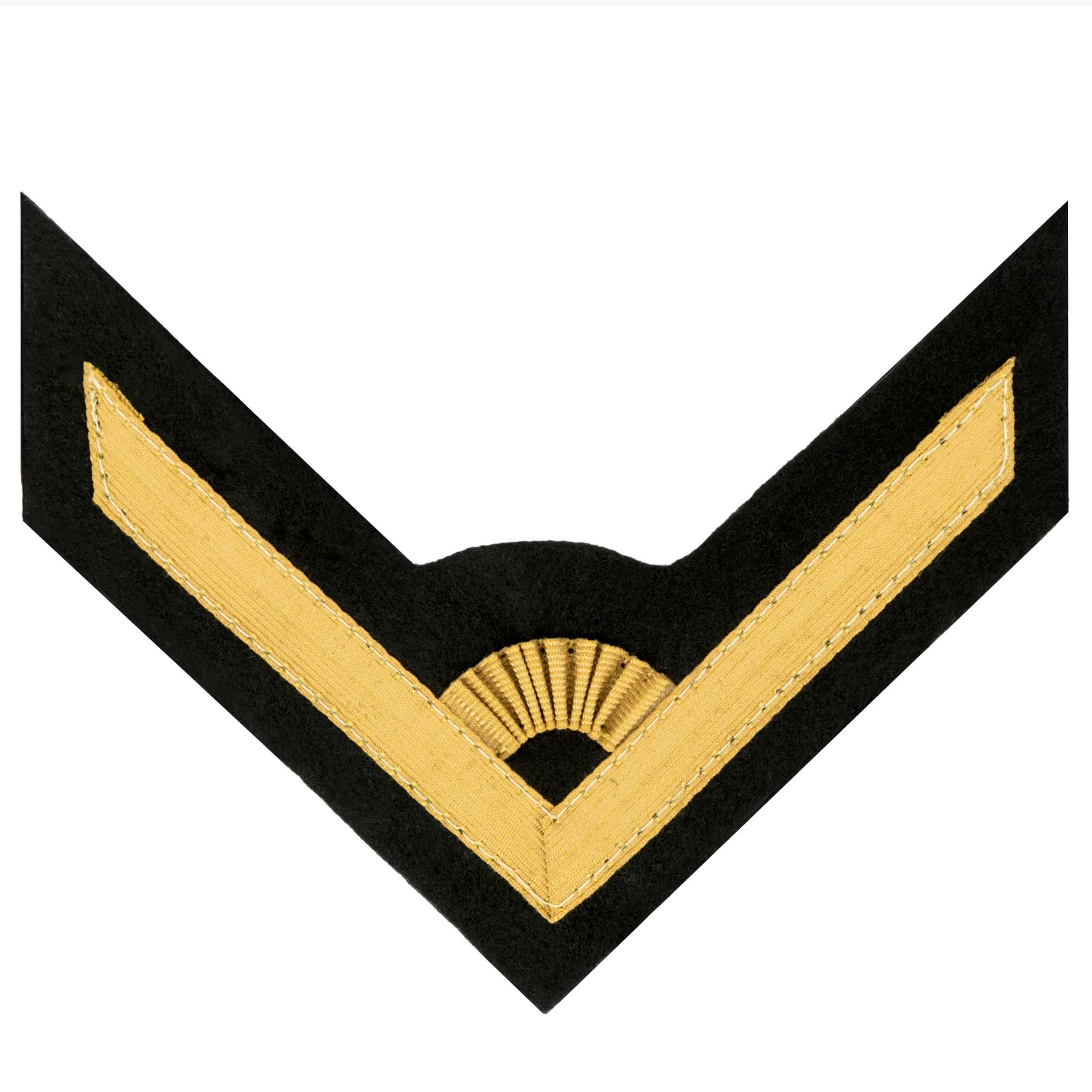Dystynkcje rękawowe do munduru wyjściowego Marynarki Wojennej RP w stopniu Młodszy Chorąży. Wykonane na czarnym sukiennym podkładzie ze złotą nicią, przeznaczone do naszycia na oba rękawy. Komplet 2 sztuki.