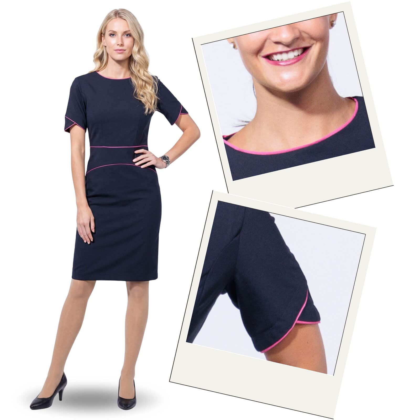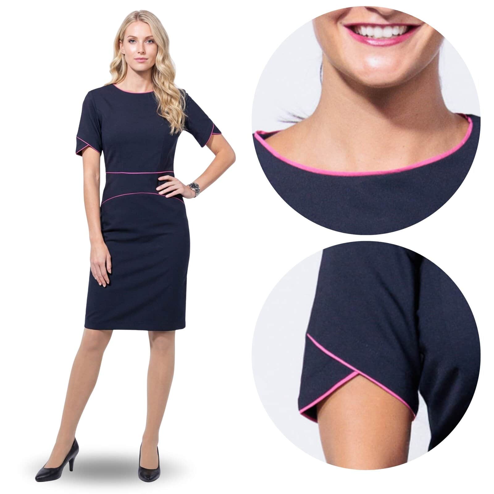 Stylowa sukienka granatowa z różowymi lamówkami to elegancki wybór do pracy, biura i na uroczystości. Kobiecy krój, modne rękawki i wysokiej jakości tkanina zapewniają komfort oraz profesjonalny wygląd.