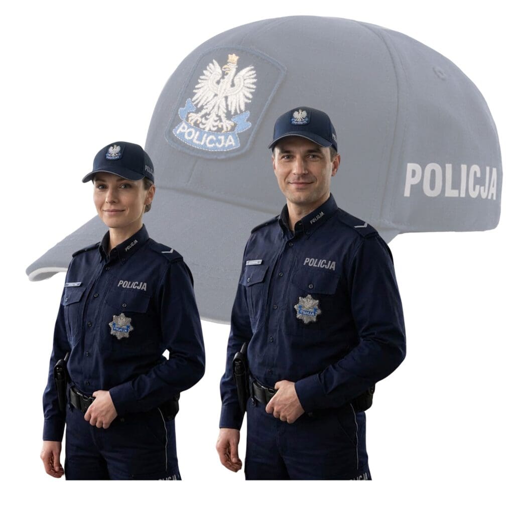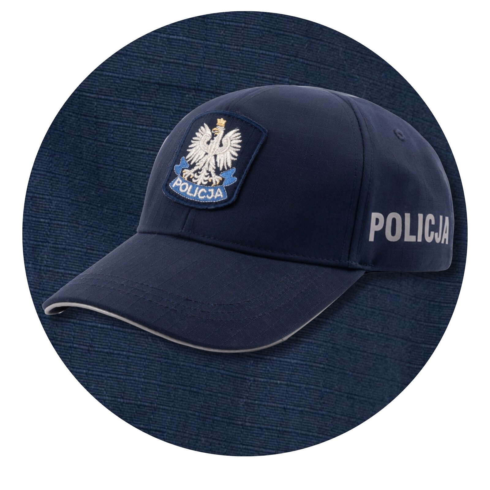 • Oznaczenia: haftowany emblemat policyjny z przodu + odblaskowe napisy POLICJA po obu stronach czapki