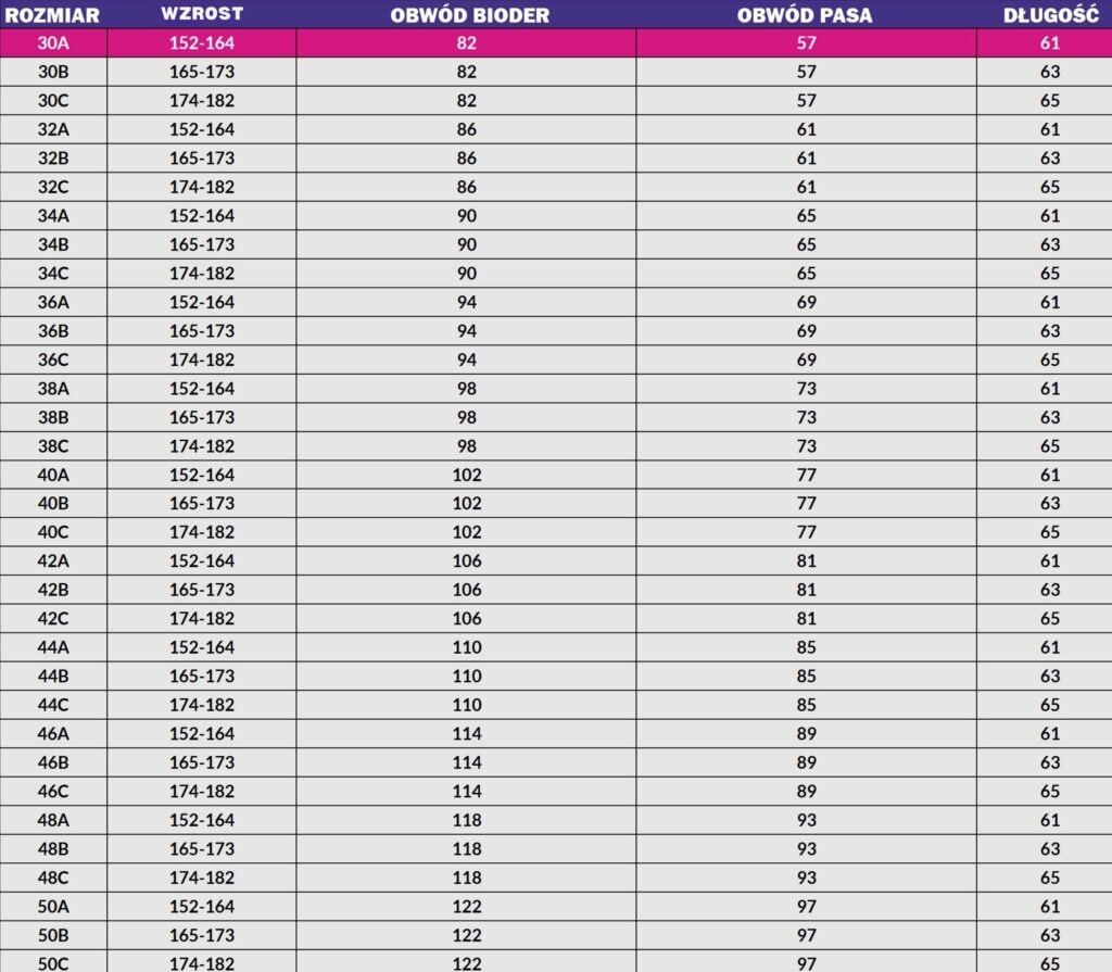 W tabeli rozmiarów dostępne są warianty A, B i C, dopasowane do różnych przedziałów wzrostu.