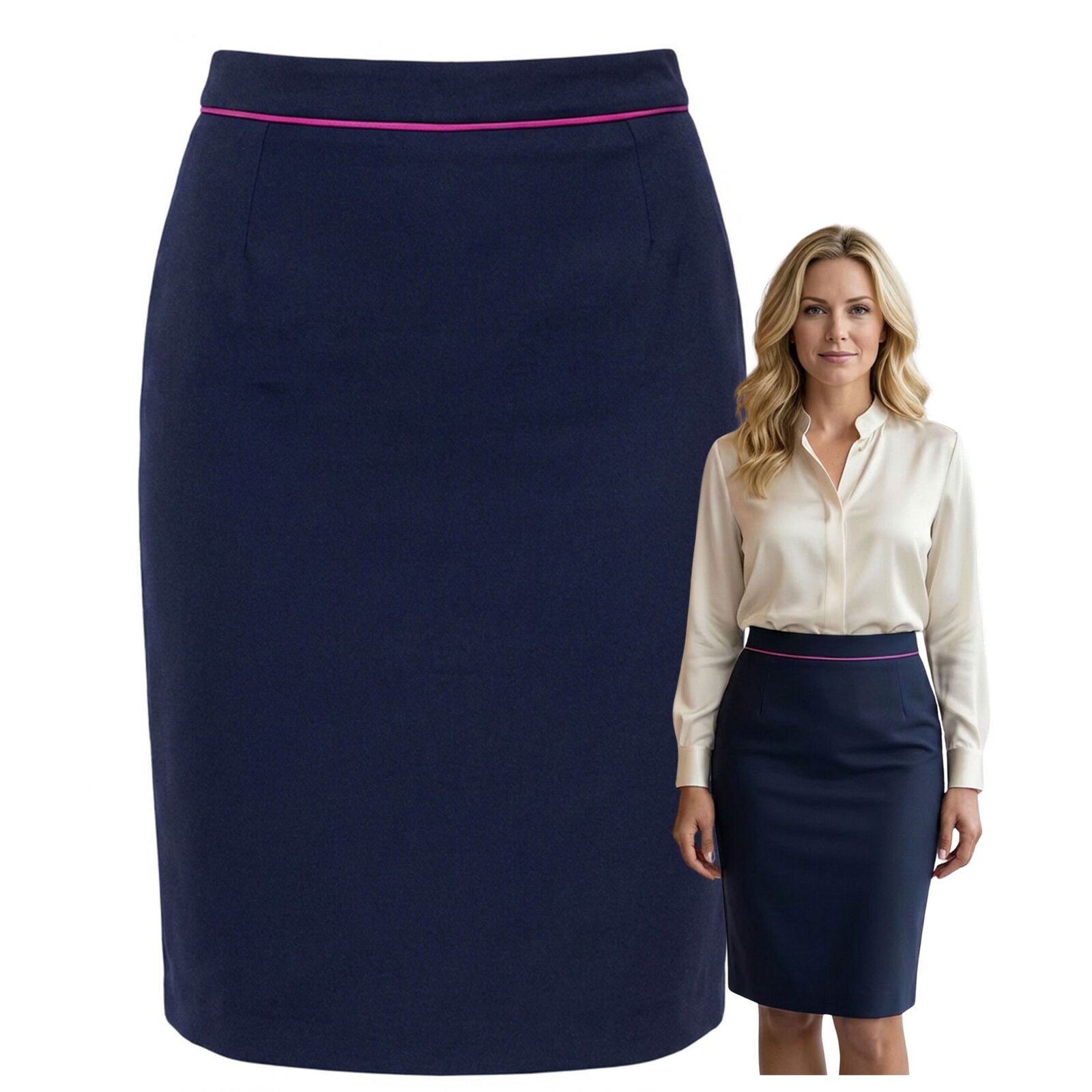 Elegancka granatowa spódnica ołówkowa w odcieniu ciemnego granatu, zaprojektowana z myślą o profesjonalnym wizerunku. Subtelny różowy pasek w talii dodaje nowoczesnego akcentu i delikatnie podkreśla sylwetkę. Idealna do pracy, stylizacji formalnych i biznesowych, a także zawsze wtedy, gdy chcesz wyglądać kobieco, elegancko i profesjonalnie.