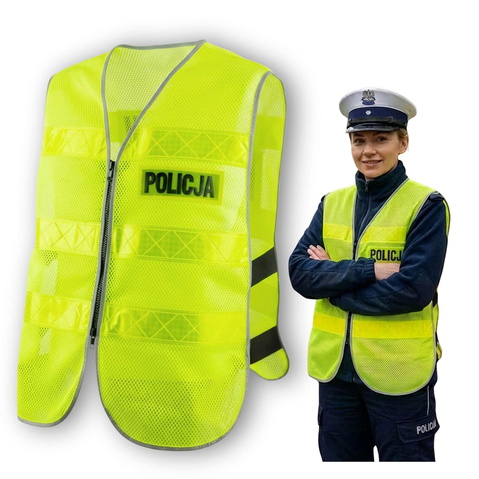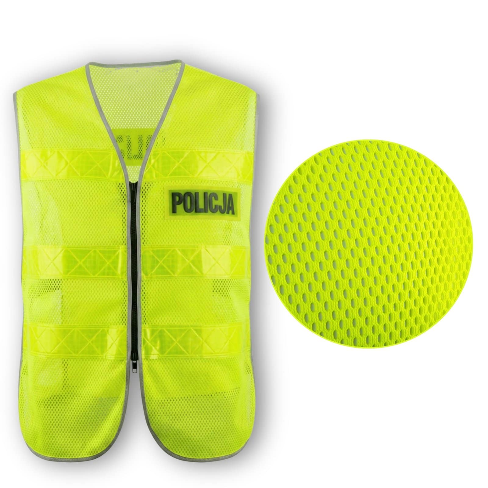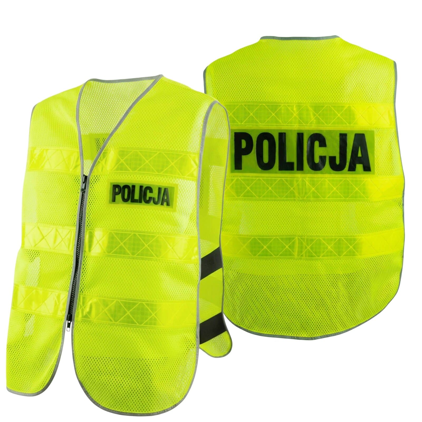 Profesjonalna kamizelka motocyklowa odblaskowa Policyjna z lekkiej, oddychającej siateczki i solidnym zamkiem błyskawicznym stworzona z myślą o bezpieczeństwie i komforcie funkcjonariuszy podczas działań ruchu drogowego, patroli, interwencji i zabezpieczeń imprez. Intensywny fluorescencyjny kolor w połączeniu z szerokimi pasami odblaskowymi oraz wyraźnym napisem POLICJA gwarantują doskonałą widoczność w każdych warunkach. Zapięcie na zamek błyskawiczny umożliwia szybkie zakładanie i zdejmowanie kamizelki, co ma kluczowe znaczenie podczas dynamicznych działań w terenie, a w szczególności na motocyklu.
