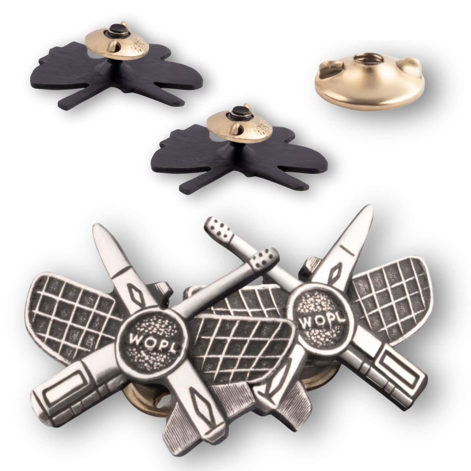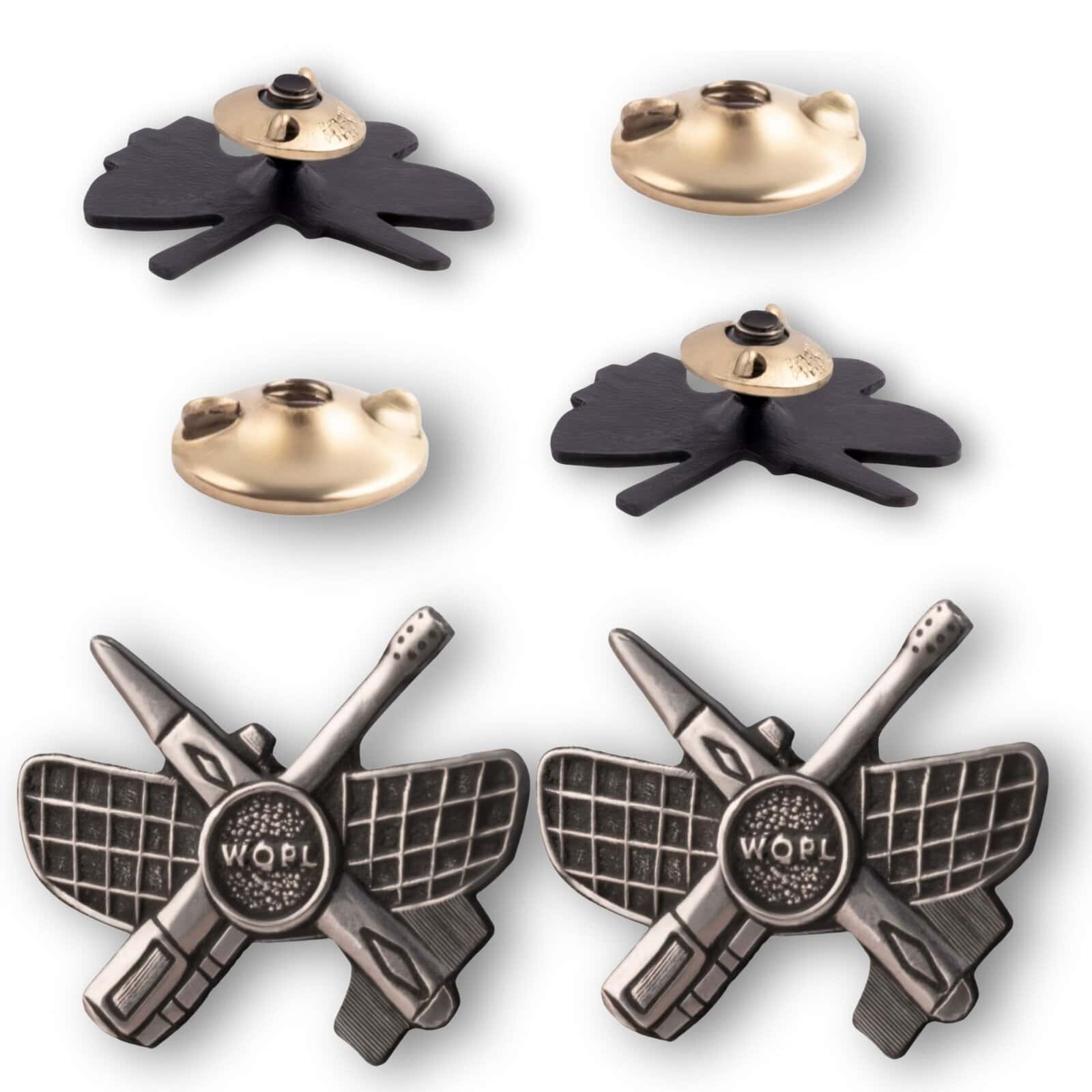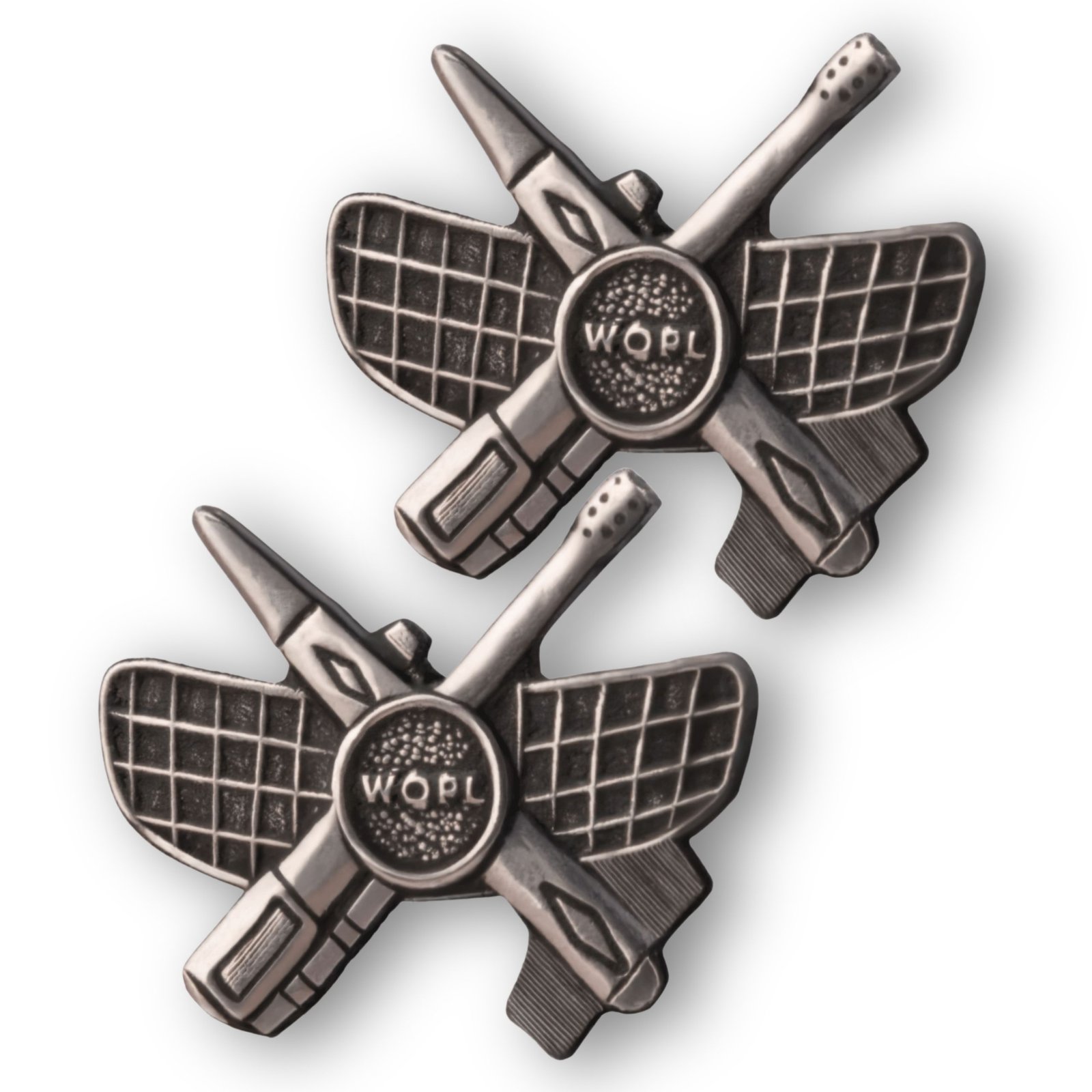 Korpusówki Wojsk Obrony Przeciwlotniczej – zestaw 2 sztuki, wykonane najwyższą starannością. Metal oksydowany w srebrnym kolorze, trwałe i odporne na korozję. Wyposażone w solidne mocowanie na pins z blokadą, idealne do munduru służbowego wojska polskiego.
