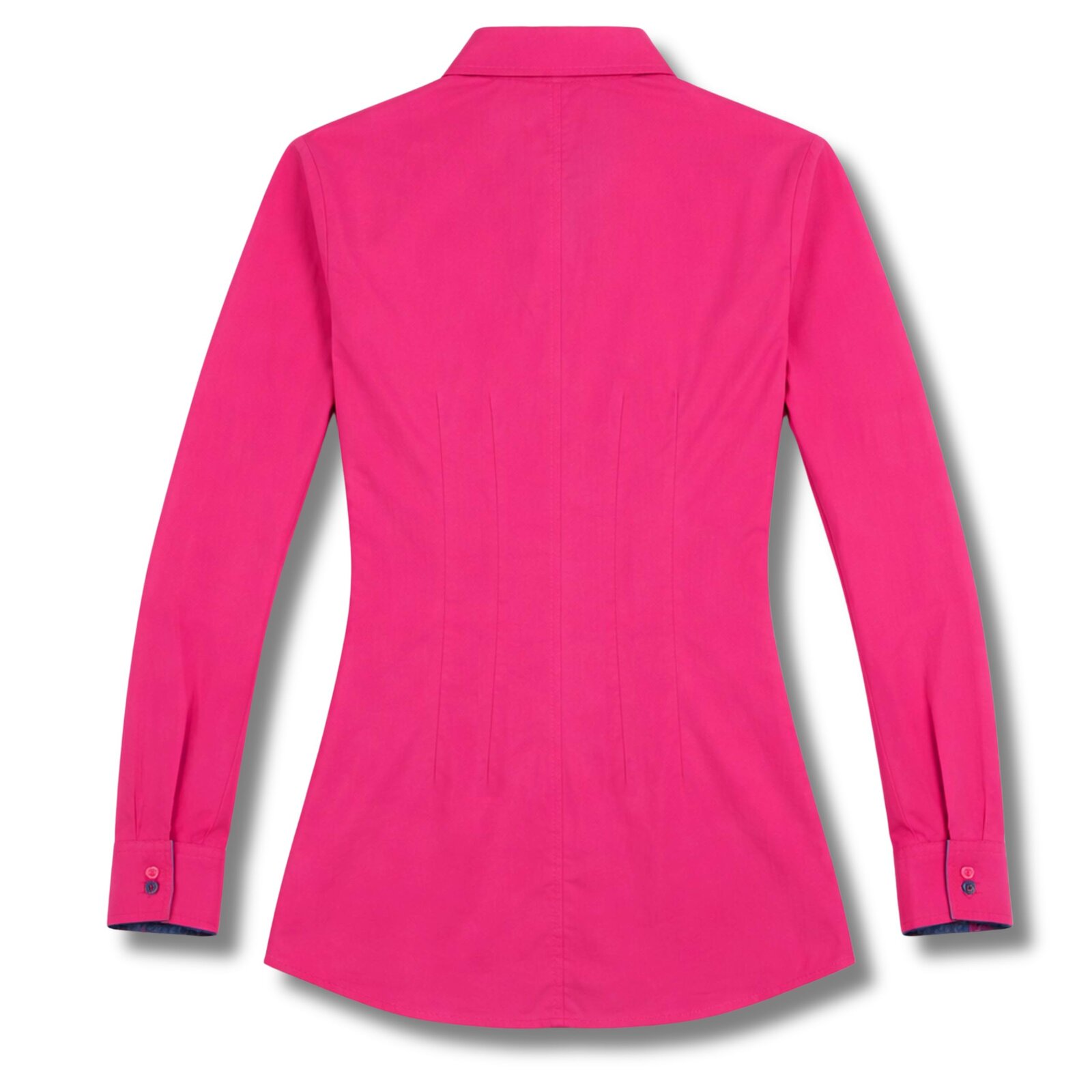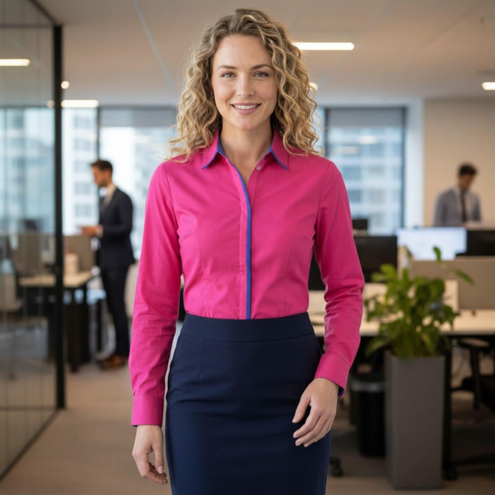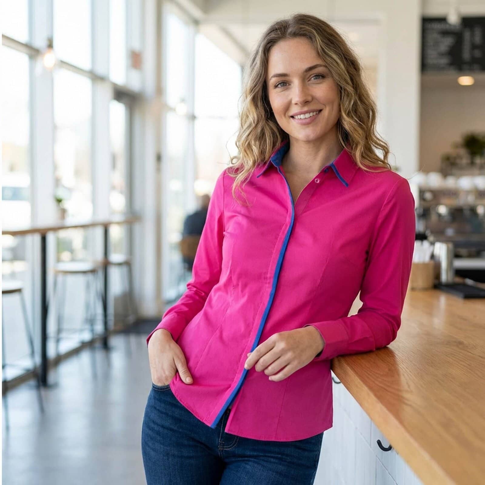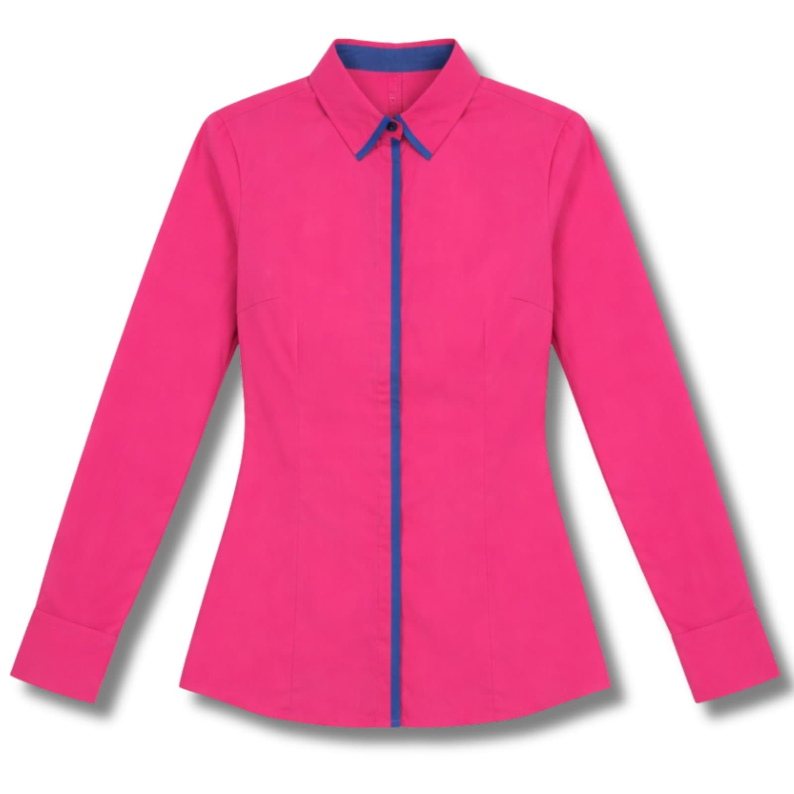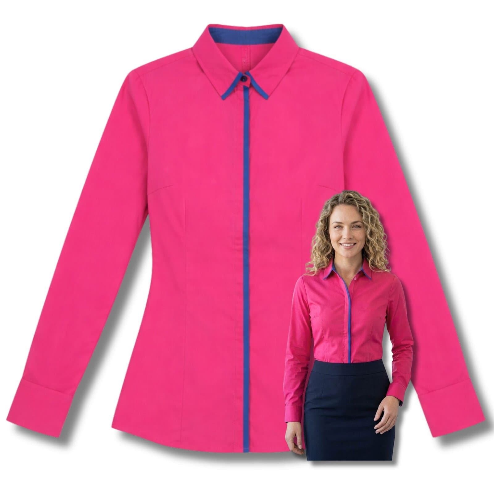 Elegancka koszula damska z długim rękawem w kolorze różowym to idealne połączenie stylu, wygody i profesjonalnego wyglądu. Kontrastowa niebieska lamówka przy kołnierzyku i listwie nadaje jej charakteru, a kryte guziki podkreślają minimalistyczne i schludne wykończenie.
