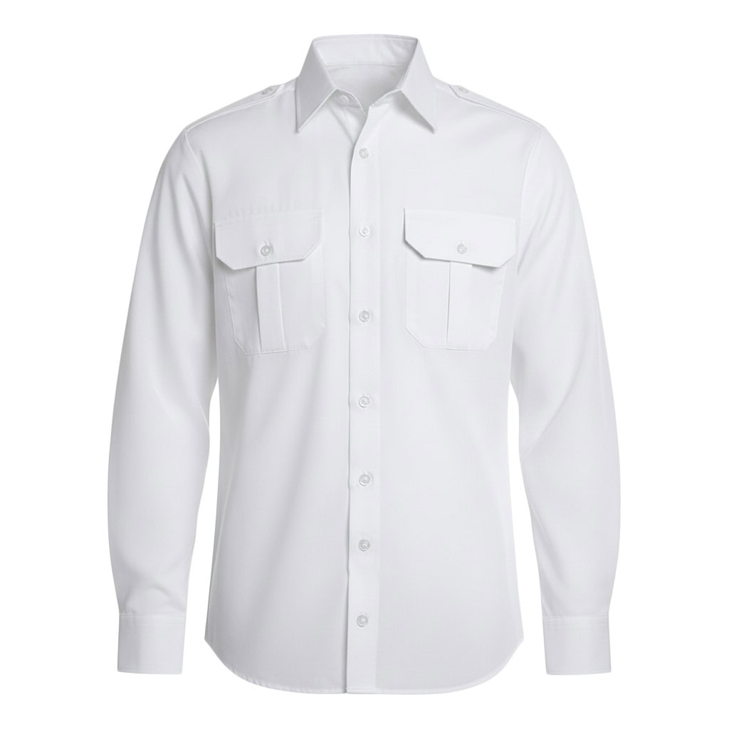 Biała koszula dla pilotów i kapitanów marynarki z długim rękawem, wykonana głównie z bawełny. Wyposażona w dwie kieszenie na piersi (jedna z otworem na długopis), eleganckie perłowe guziki oraz białe naramienniki do pochewek ze stopniem. Idealna do umundurowania lotniczego i morskiego, na służbę i uroczystości.