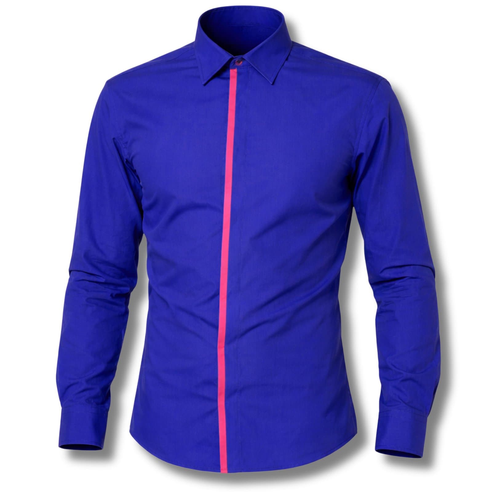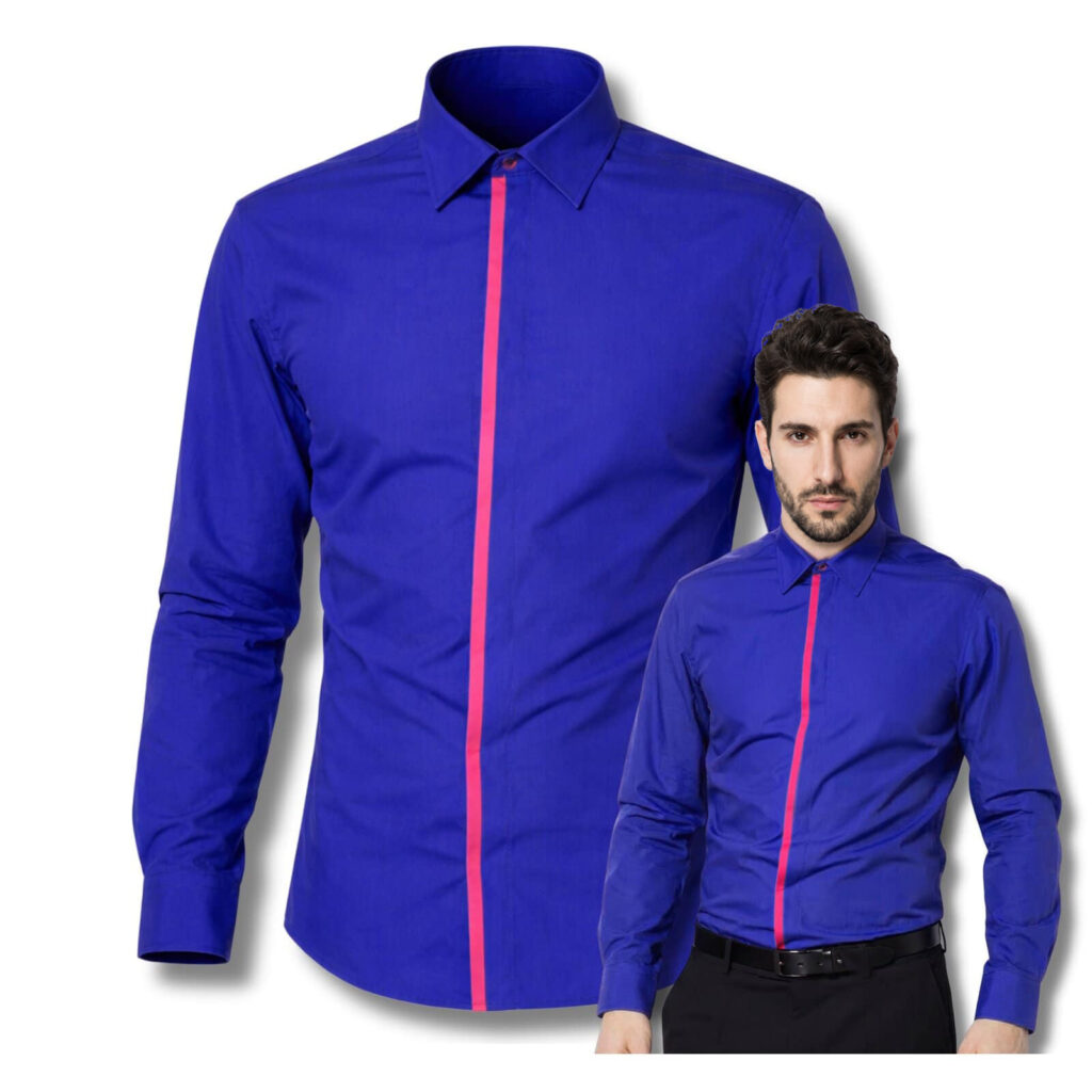 Elegancka męska koszula z długim rękawem w kolorze niebieskim kobaltowym, z kontrastową niebieską lamówką przy kołnierzyku i listwie zapięcia. Model posiada kryte guziki ukryte pod listwą, co nadaje koszuli estetyczny i bardzo elegancki wygląd. Wykonana z tkaniny 60% bawełna i 40% poliester, zapewnia komfort noszenia i świetnie sprawdzi się jako koszula do pracy, koszula biurowa męska oraz element eleganckich codziennych stylizacji.