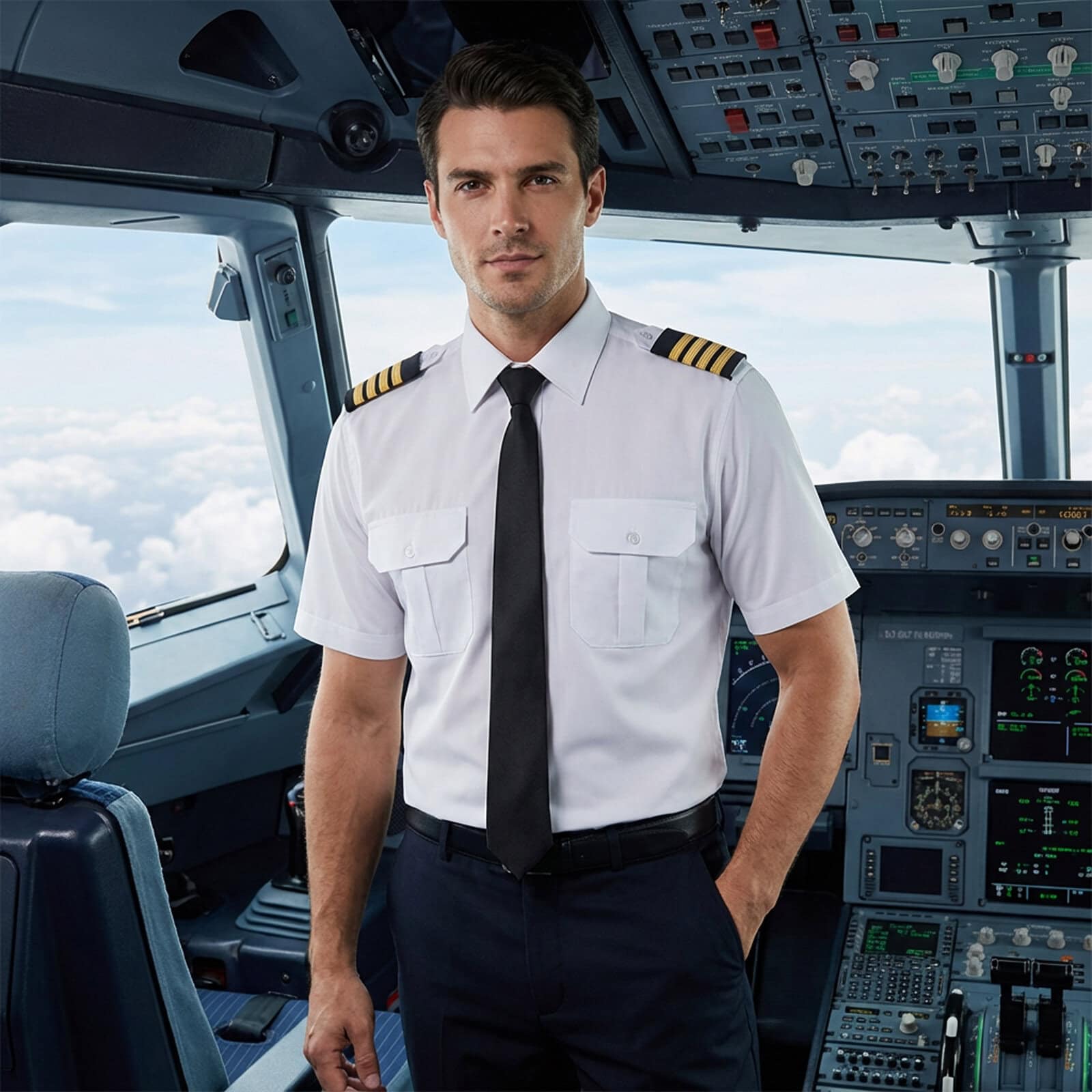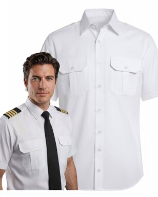 Biała koszula dla pilotów i marynarzy z krótkim rękawem, wykonana głównie z bawełny. Wyposażona w dwie kieszenie na piersi (jedna z otworem na długopis), eleganckie perłowe guziki oraz białe naramienniki do pochewek ze stopniem. Idealna do umundurowania lotniczego i morskiego, na służbę i uroczystości.