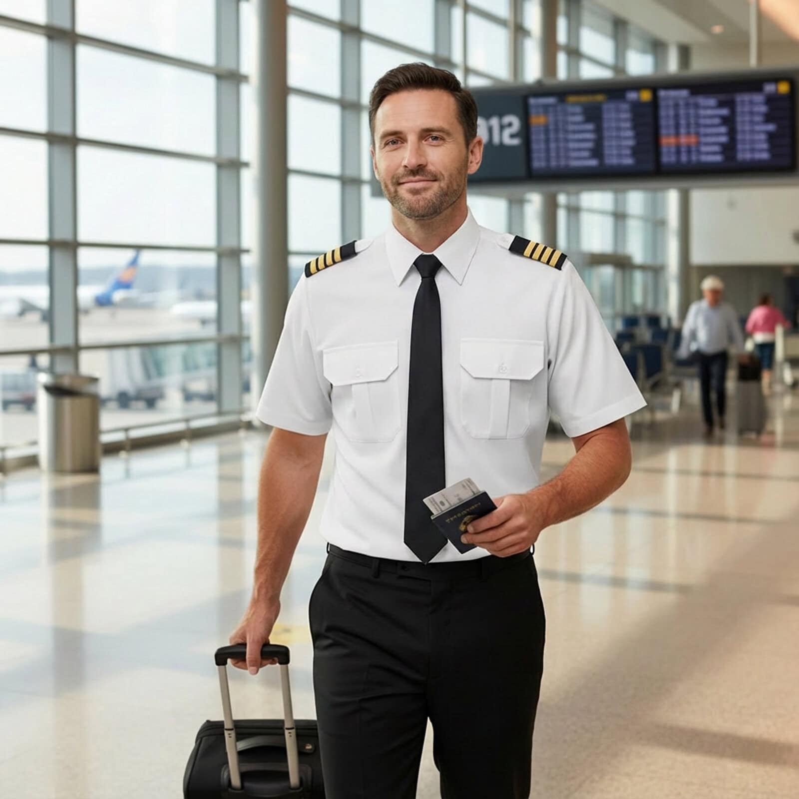 Elegancka, biała koszula męska ceremonialna z krótkim rękawem, wykonana w przewadze z wysokogatunkowej bawełny. Zaprojektowana dla pilotów samolotów oraz marynarzy, zapewnia klasyczny wygląd, wygodę użytkowania i profesjonalny charakter. Wyposażona w dwie kieszenie na piersiach (jedna z otworem na długopis), białe naramienniki pozwalające na montaż pochewek ze stopniem oraz perłowe, subtelnie połyskujące guziki, które nadają koszuli wyjątkową elegancję.