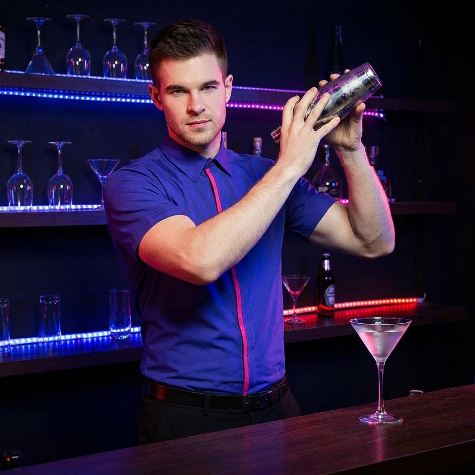 Elegancka męska koszula z krótkim rękawem w kolorze różowym z kontrastową niebieską lamówką przy kołnierzyku i listwie zapięcia. Model posiada kryte guziki ukryte pod listwą, co nadaje koszuli estetyczny i bardzo elegancki wygląd. Wykonana z tkaniny 60% bawełna i 40% poliester, zapewnia komfort noszenia i świetnie sprawdzi się jako koszula do pracy, koszula biurowa męska oraz element eleganckich codziennych stylizacji.