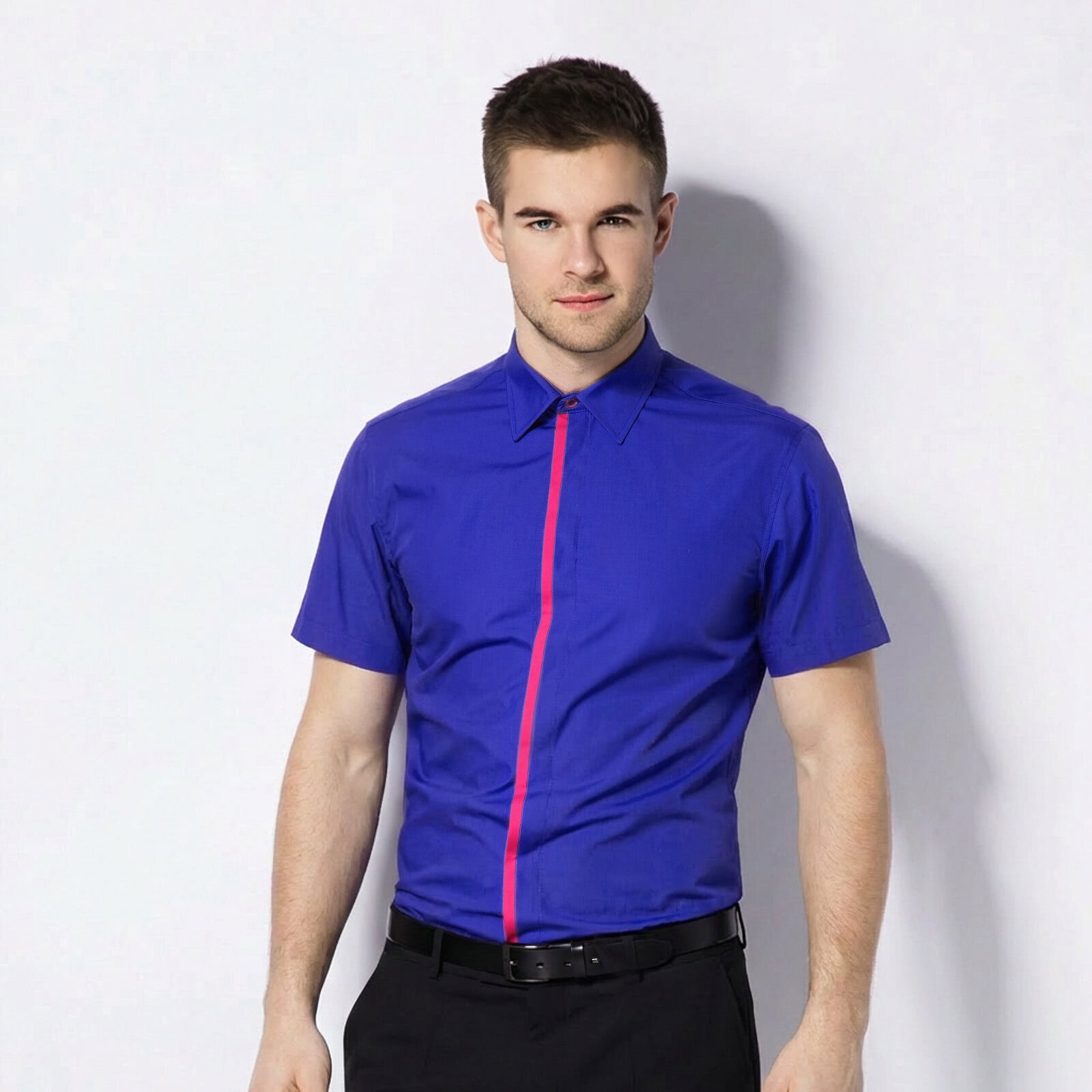 Elegancka męska koszula z krótkim rękawem w kolorze niebieskim to połączenie nowoczesnego stylu, wygody i profesjonalnego wyglądu. Charakterystyczna kontrastowa różowa lamówka przy listwie guzikowej i kołnierzyku nadaje koszuli wyjątkowego charakteru oraz podkreśla jej elegancki, biznesowy styl.
