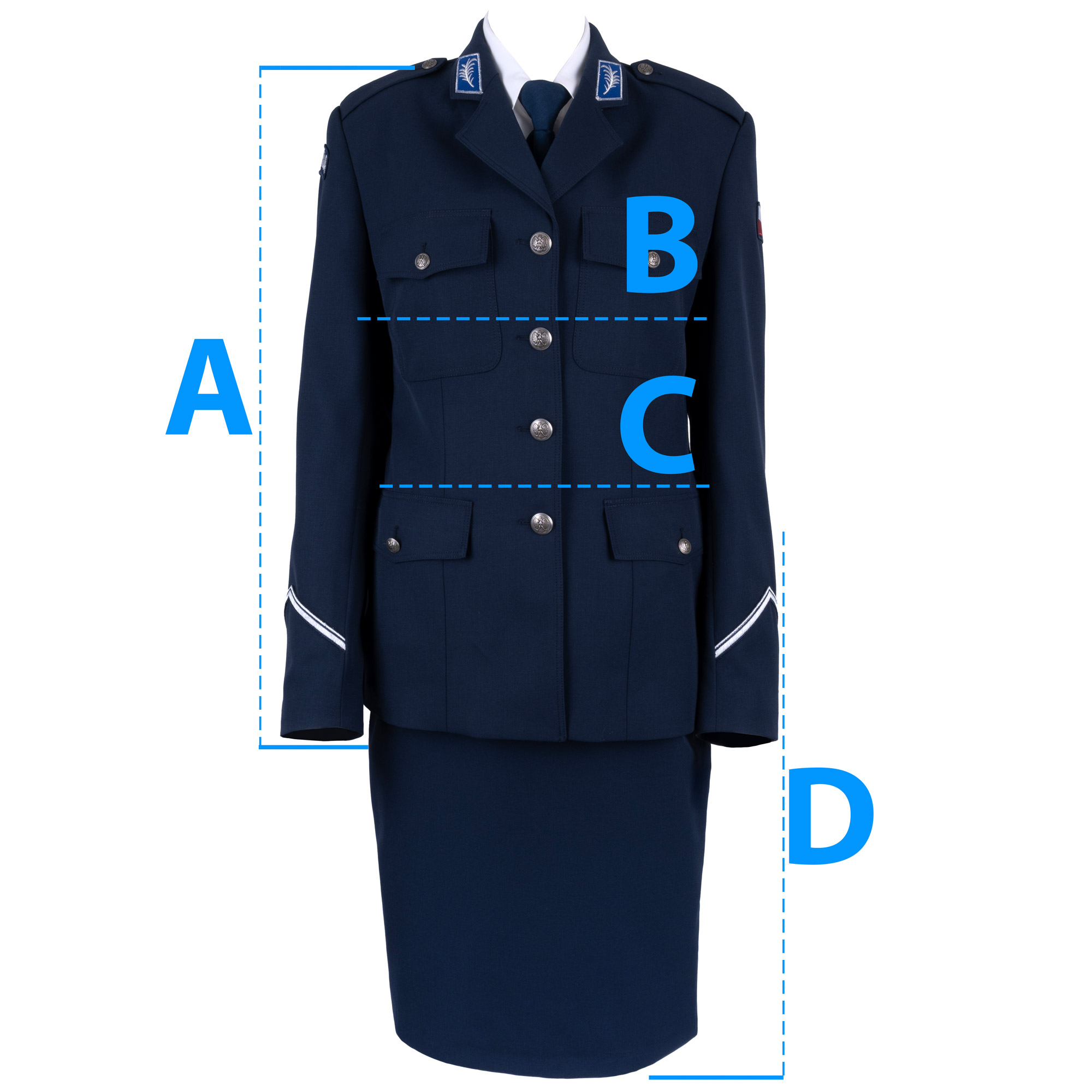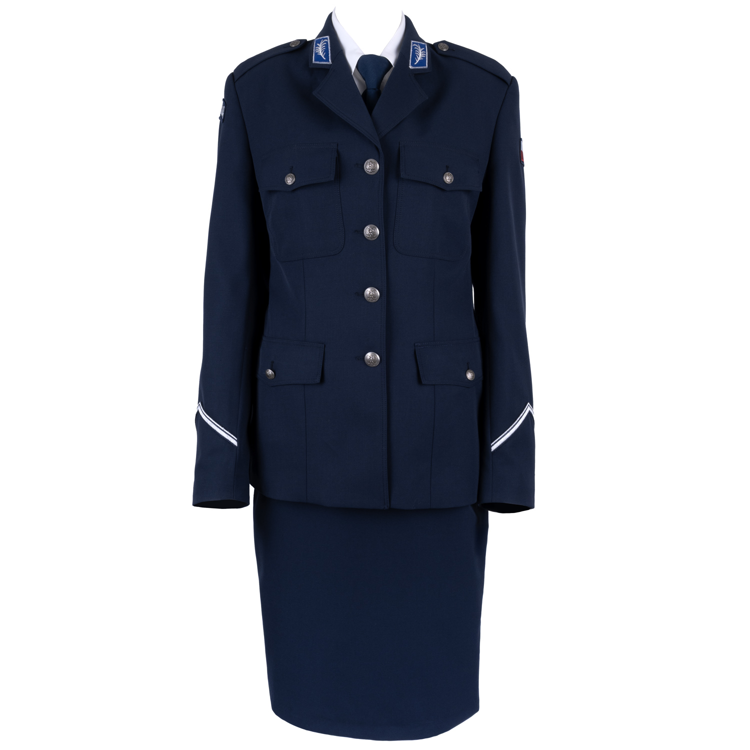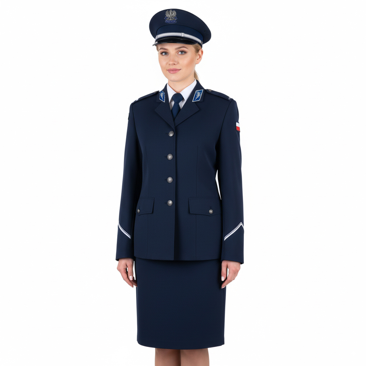 ompletny mundur wyjściowy Policji – nowy wzór, wykonany ściśle według obowiązującego umundurowania funkcjonariuszy Policji. Elegancka marynarka i spódnica w zestawie.