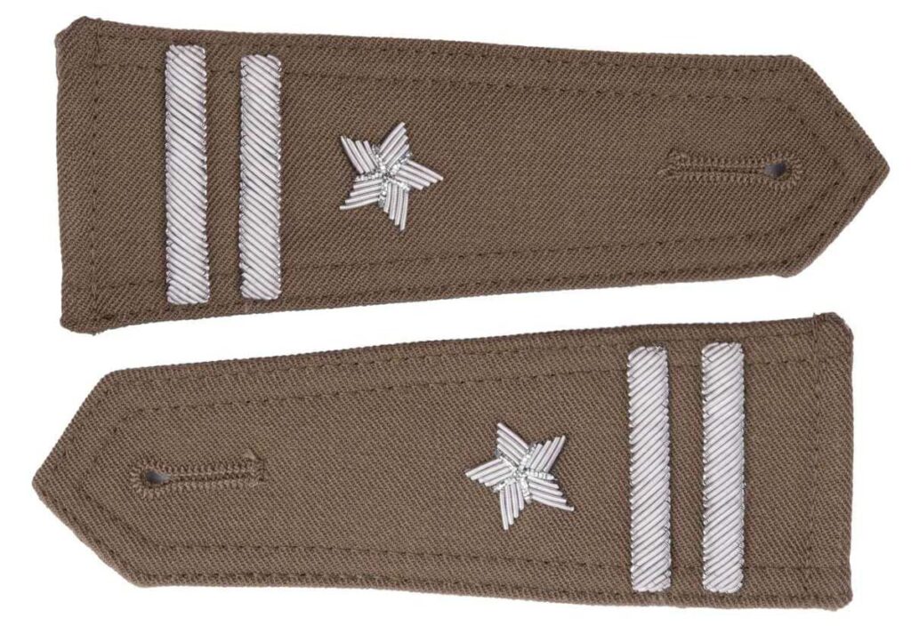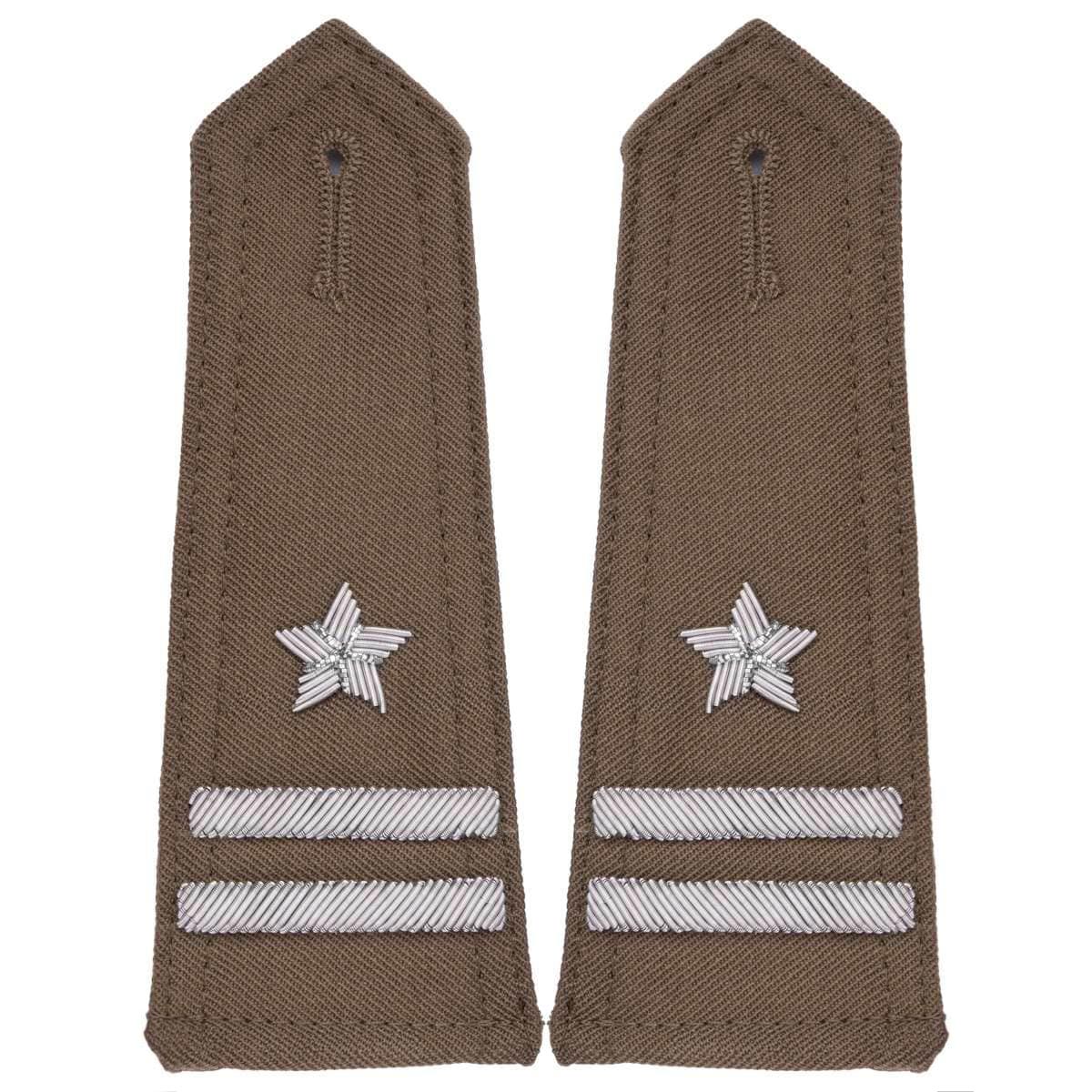 Eleganckie naramienniki (pagony) w kolorze khaki, wykonane z wysokiej jakości gabardyny z precyzyjnym haftem ręcznym. Przeznaczone do koszulobluzy, wyposażone w otwory na guziki dla łatwego mocowania na ramionach koszulo-bluzy.