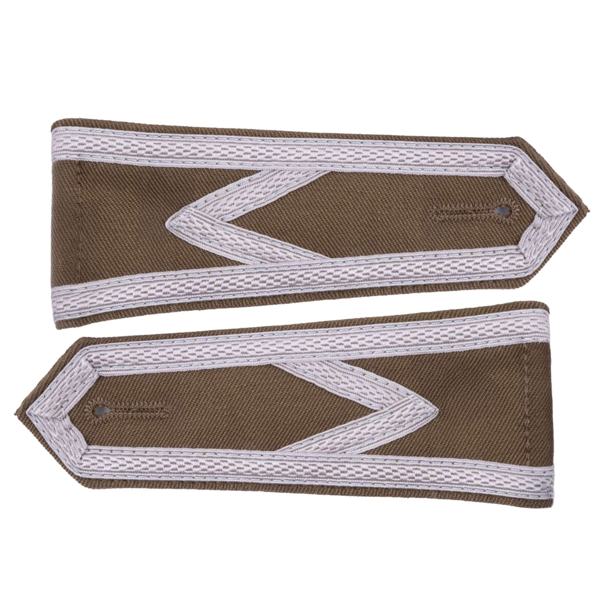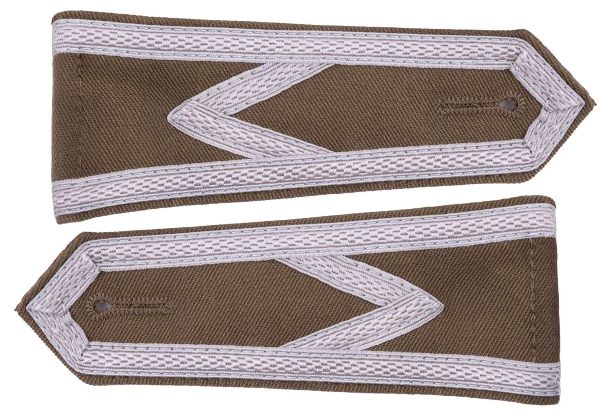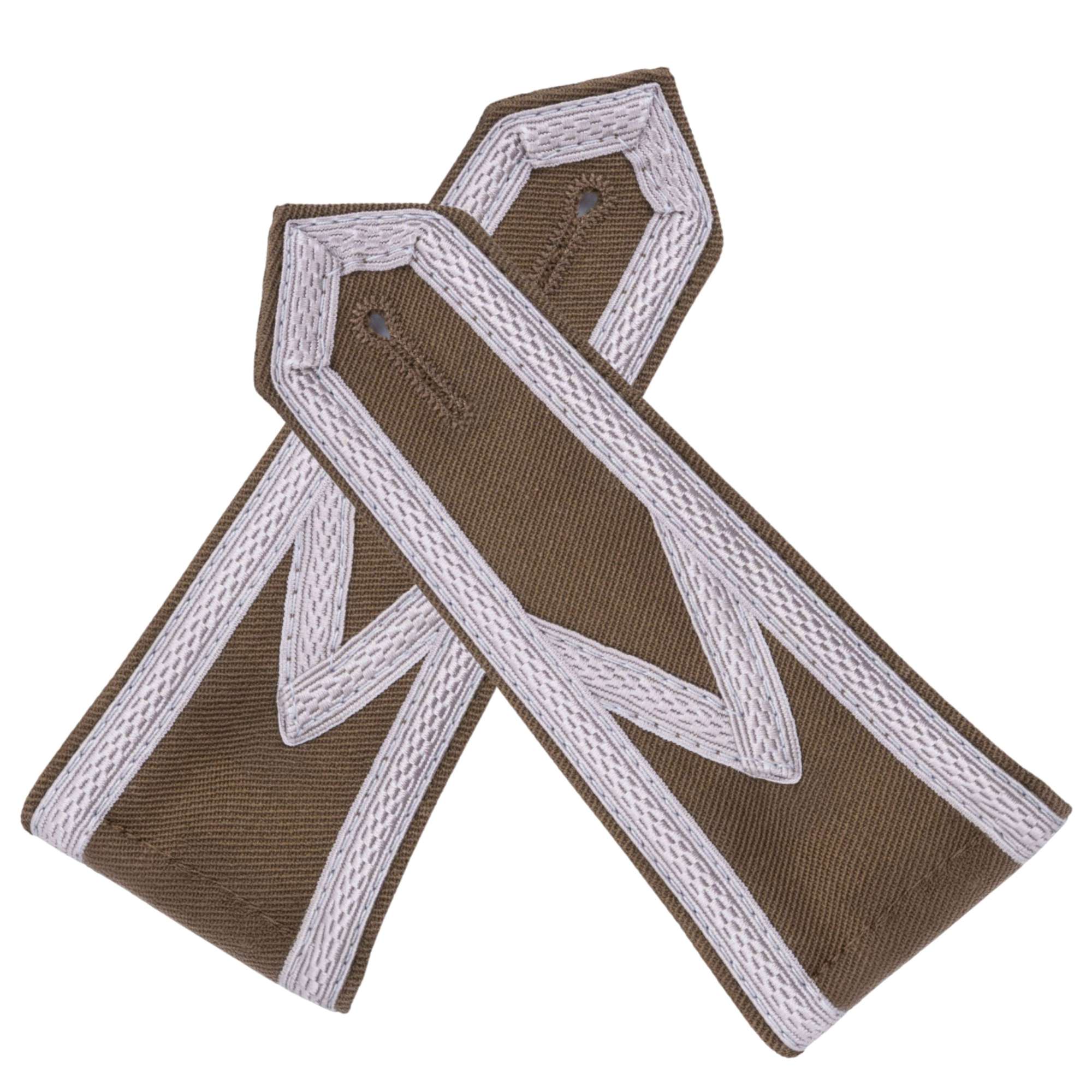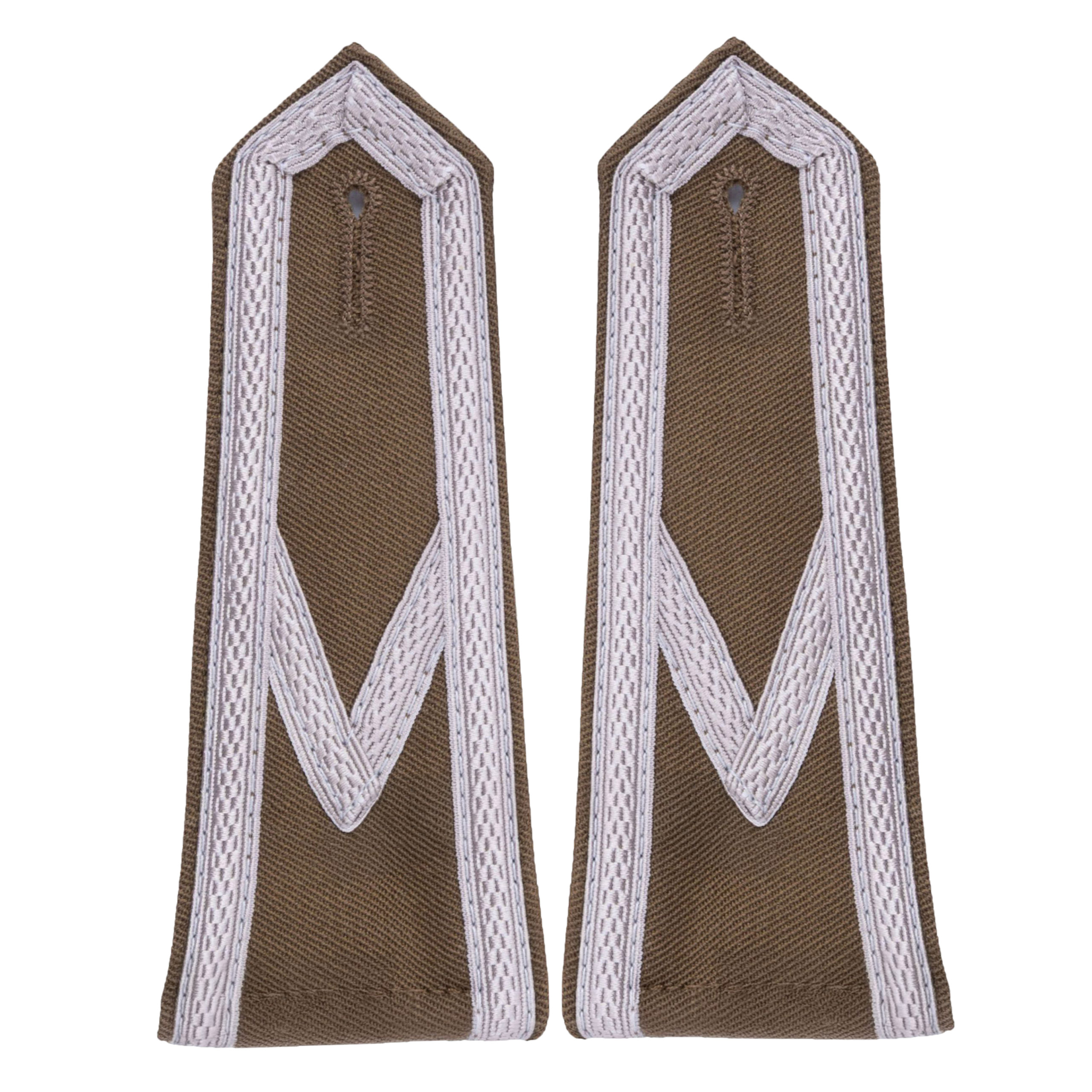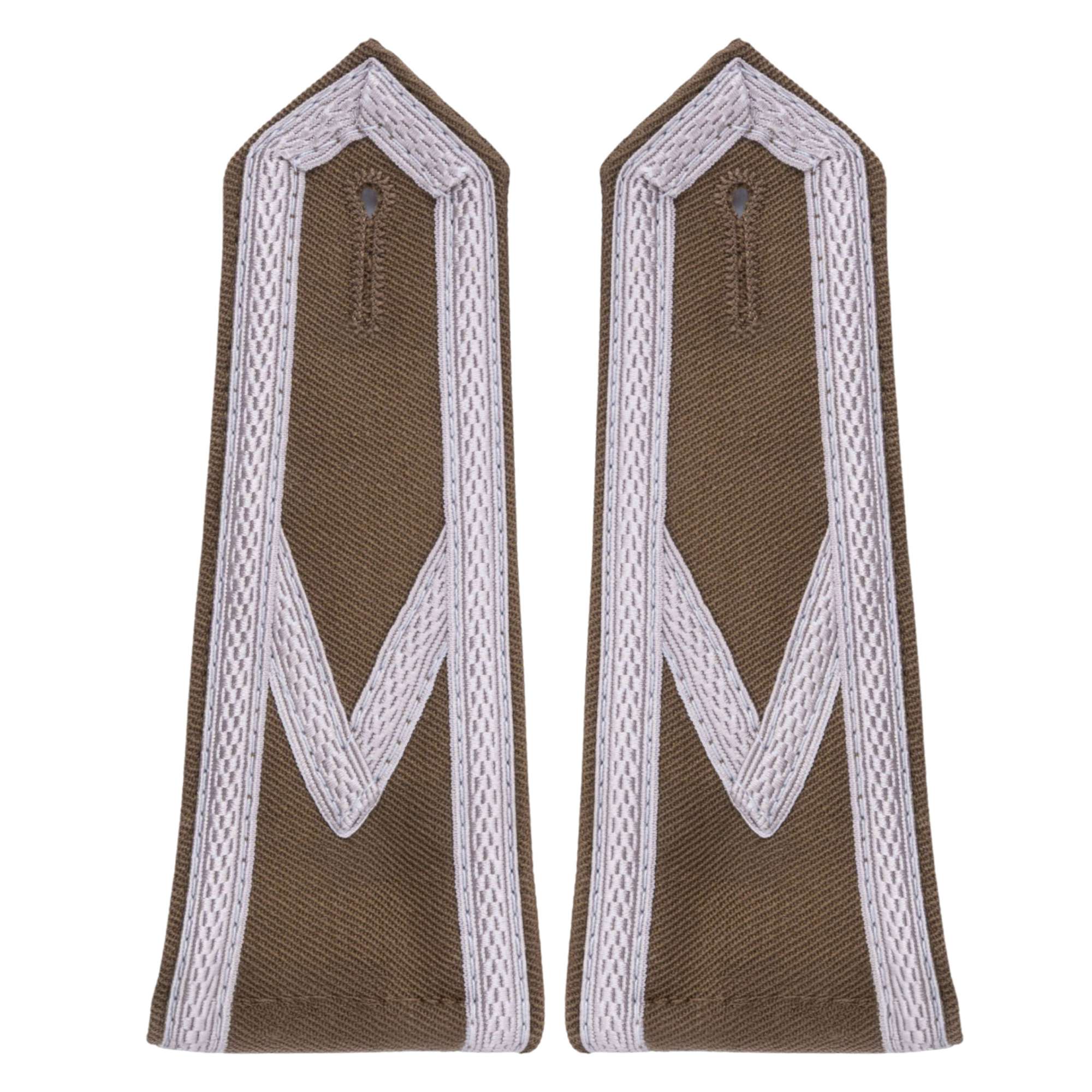 Eleganckie naramienniki (pagony) w kolorze khaki, wykonane z wysokiej jakości gabardyny z precyzyjnym haftem ręcznym. Przeznaczone do koszulobluzy, wyposażone w otwory na guziki dla łatwego mocowania na ramionach koszulo-bluzy.