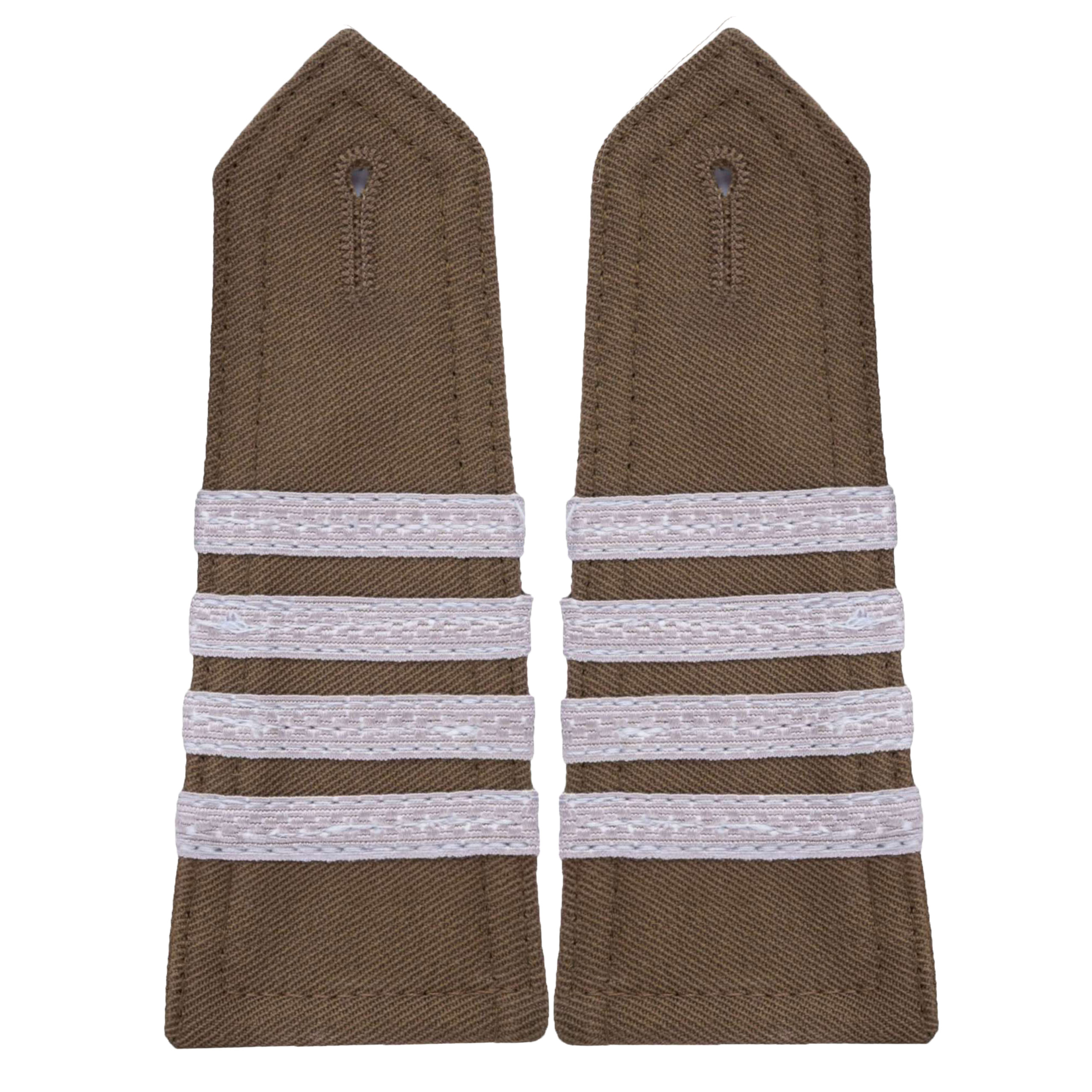 Eleganckie naramienniki (pagony) w kolorze khaki, wykonane z wysokiej jakości gabardyny z precyzyjnym haftem ręcznym. Przeznaczone do koszulobluzy, wyposażone w otwory na guziki dla łatwego mocowania na ramionach koszulo-bluzy.
