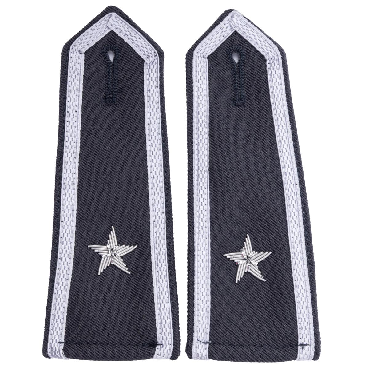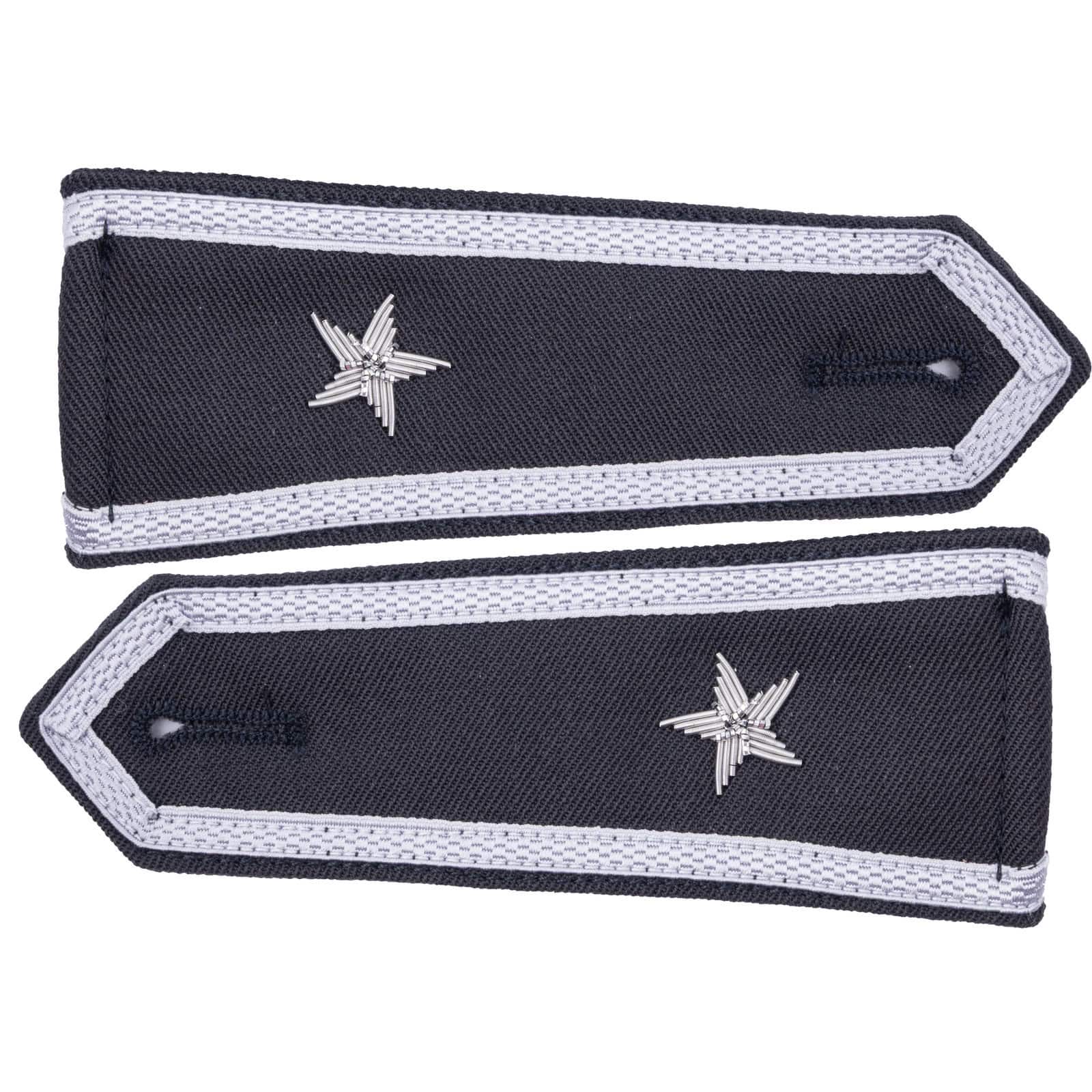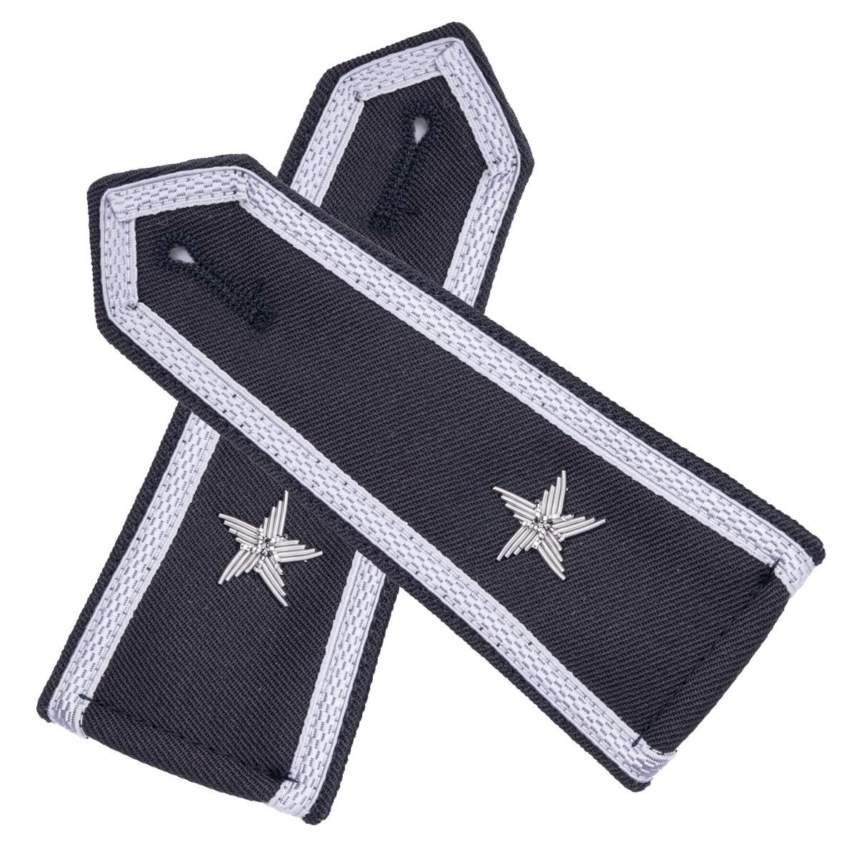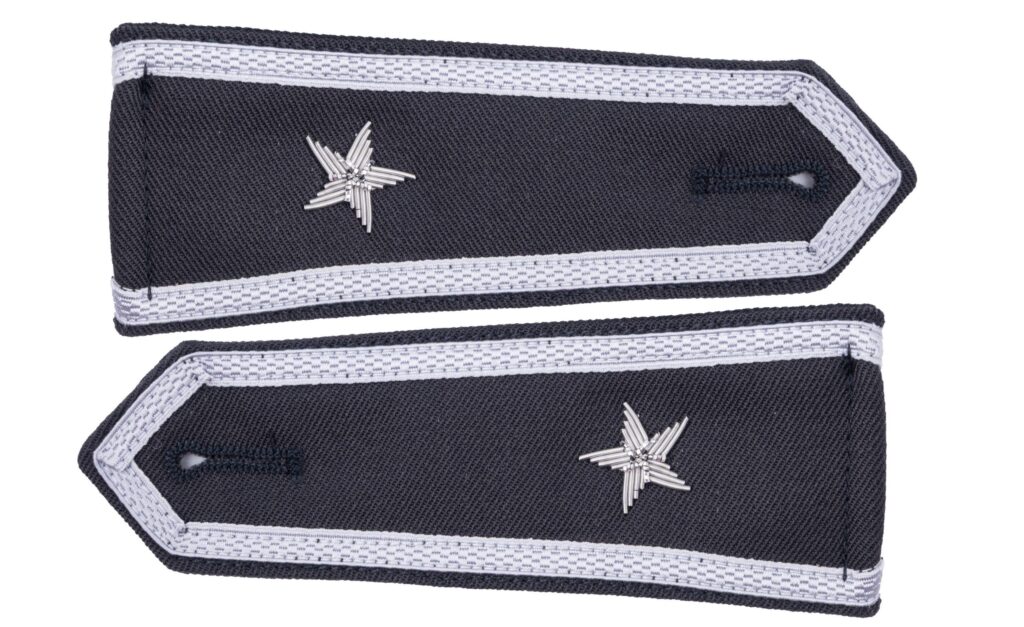 Eleganckie naramienniki (pagony) w kolorze stalowym, wykonane z wysokiej jakości gabardyny z precyzyjnym haftem ręcznym. Przeznaczone do koszulobluzy, wyposażone w otwory na guziki dla łatwego mocowania na ramionach koszulo-bluzy.