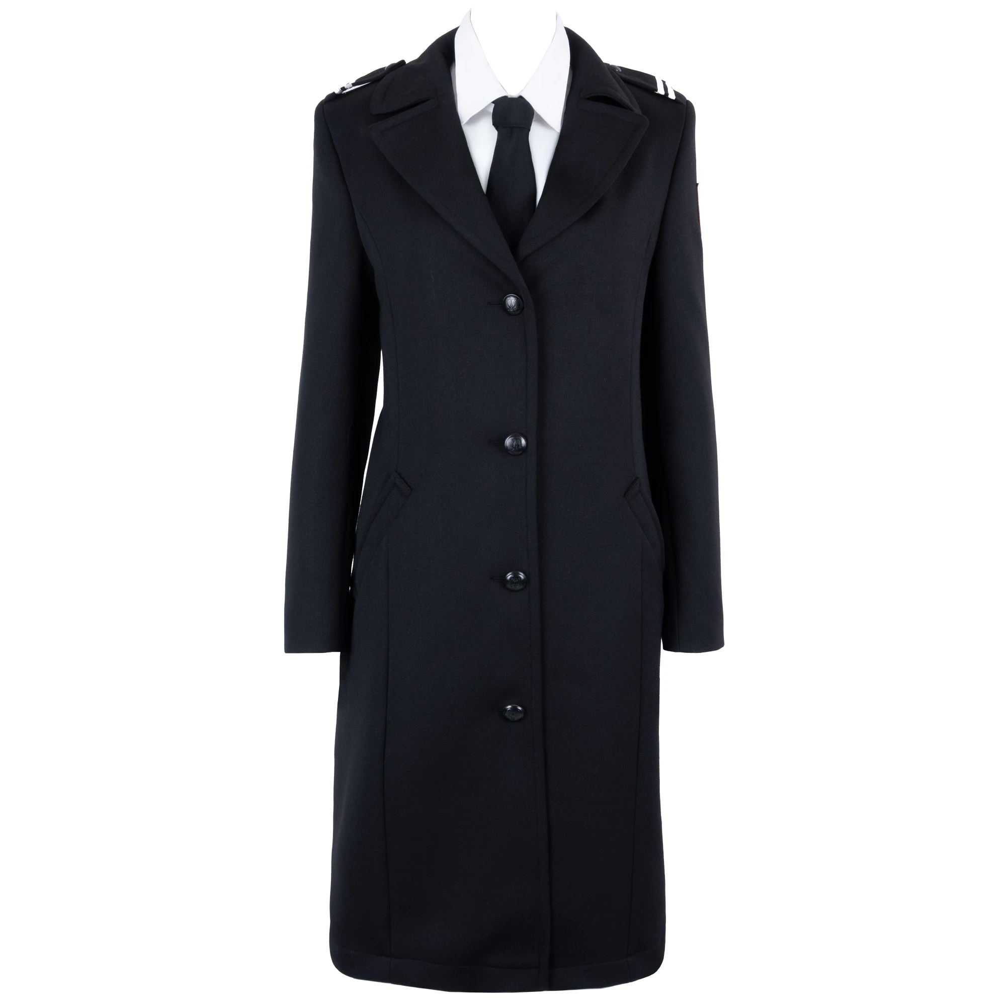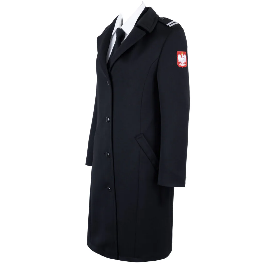 Płaszcz damski według wzoru 215D/MON to oficjalny element umundurowania Sił Powietrznych, przeznaczony do całorocznego noszenia. Wykonany z wysokiej jakości tkaniny w kolorze czarnym, zaprojektowany z myślą o połączeniu elegancji z funkcjonalnością. Klasyczny, jednorzędowy fason z podpinką, taliowaniem i guzikami z orłem wojskowym sprawia, że płaszcz prezentuje się reprezentacyjnie podczas uroczystości wojskowych i oficjalnych wyjść służbowych.