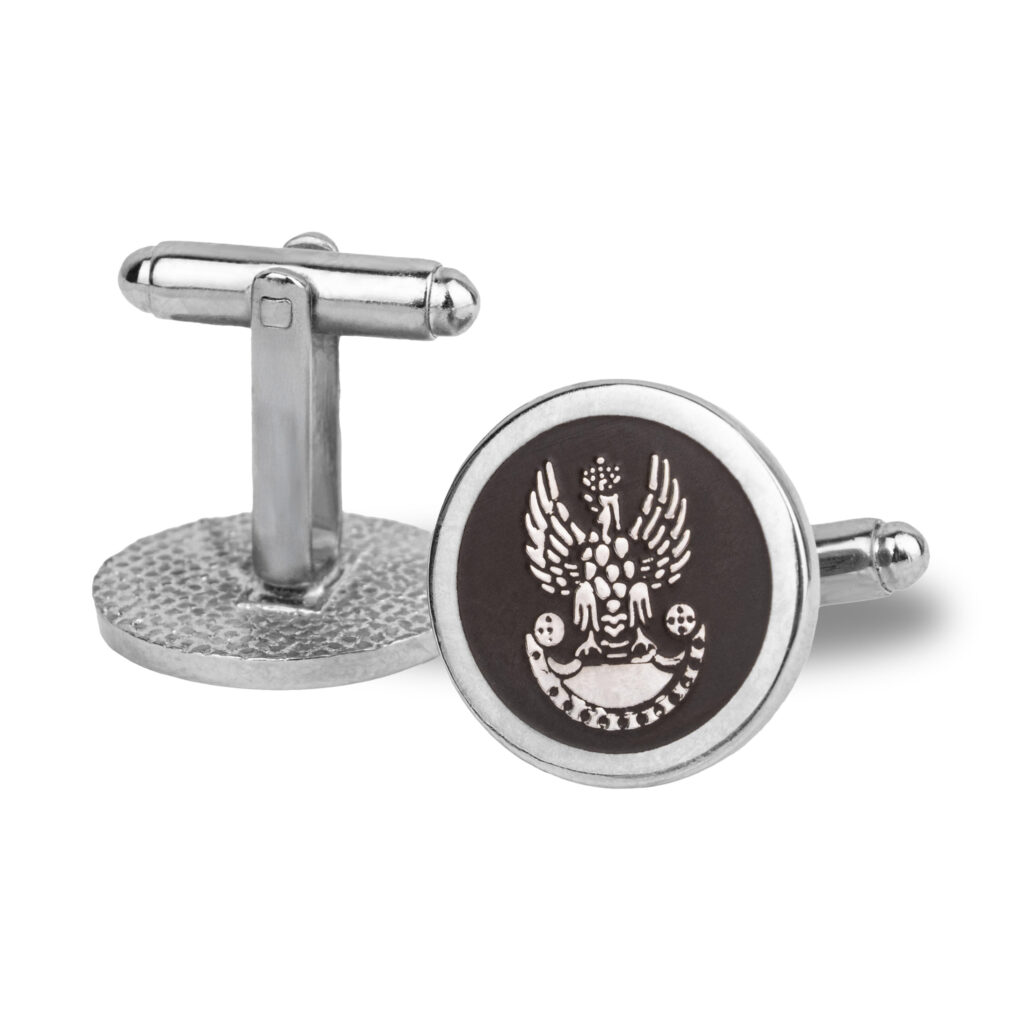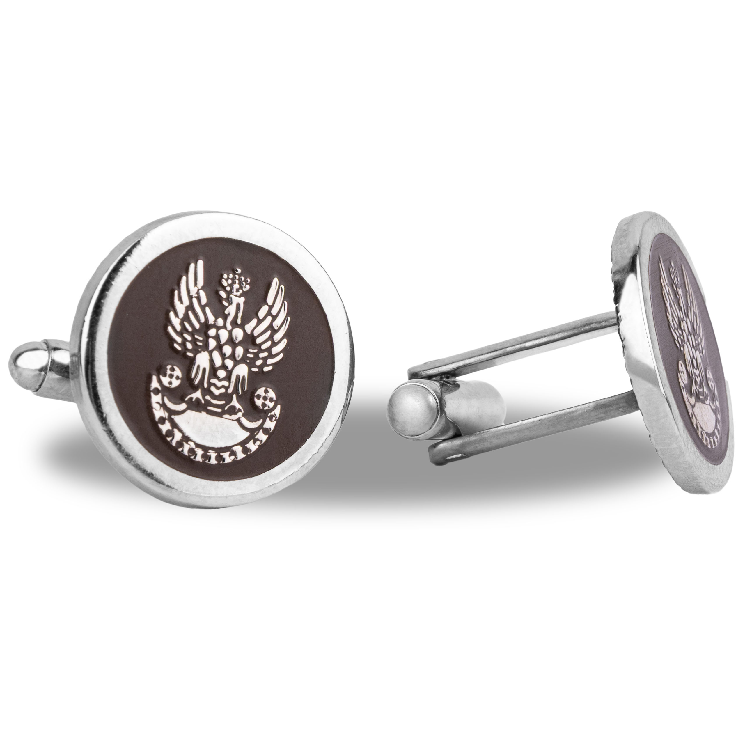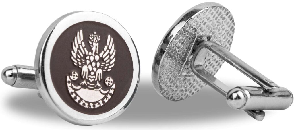 • Spinki do mankietów: Wykonane z wysokiej jakości stali w kolorze niklowanym, ozdobione eleganckim wizerunkiem orła umieszczonym w subtelnym okręgu.