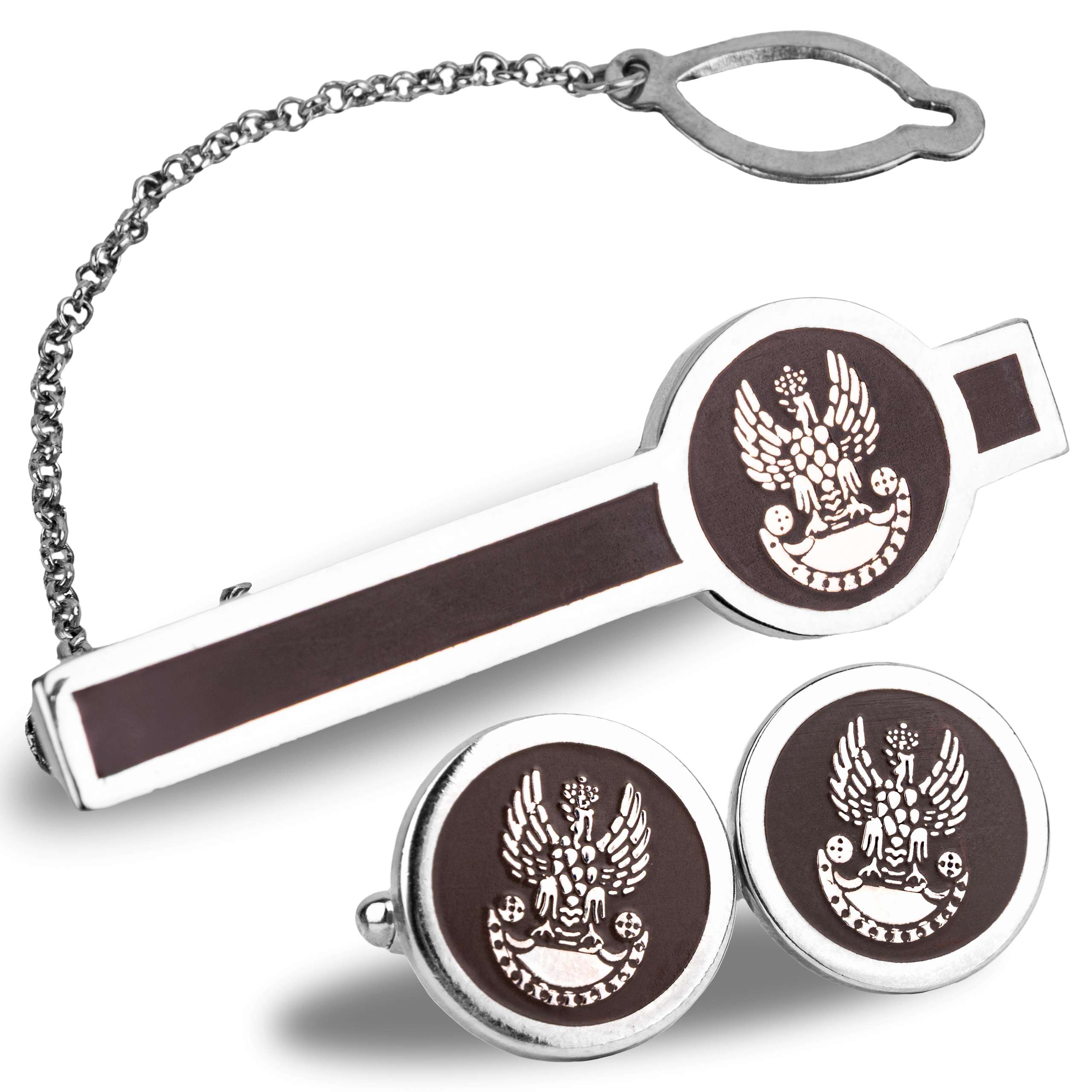 Zestaw spinek do mankietów i krawata Wojsk Lądowych wzór 841A/MON, wykonany z wysokiej jakości stali w kolorze niklowanym. Ozdobiony emblematem z orłem wojskowym, symbolizującym honor i tradycję służby. Elegancki, trwały i uniwersalny – idealny do munduru, garnituru oraz jako prezent dla żołnierza lub miłośnika militariów.