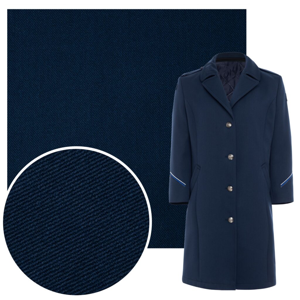 Wysokiej jakości tkanina mundurowa w odcieniu granatowym, przeznaczona do szycia płaszczy wyjściowych Policji. Łączy elegancki wygląd z trwałością i odpornością na intensywne użytkowanie. Wykonana z mieszanki wełny i poliestru, zapewnia komfort noszenia, dobrą termoizolację i estetykę.
